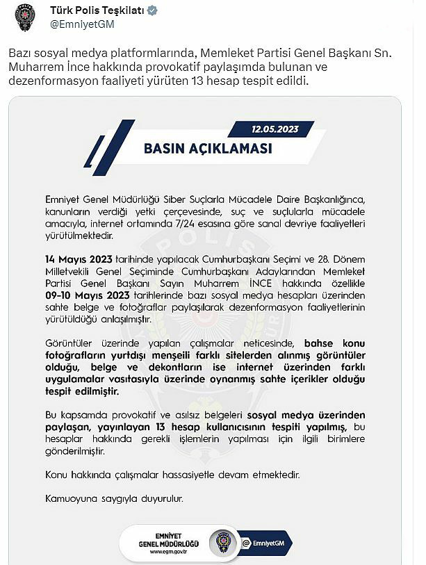 Emniyet Genel Müdürlüğü, Memleket Partisi Genel Başkanı Muharrem İnce hakkındaki iddialara ilişkin, “Görüntüler üzerinde yapılan çalışmalar neticesinde, bahse konu fotoğrafların yurt dışı menşeili farklı sitelerden alınmış görüntüler olduğu, belge ve dekontların ise internet üzerinden farklı uygulamalar vasıtasıyla üzerinde oynanmış sahte içerikler olduğu tespit edilmiştir. Bu kapsamda, provokatif ve asılsız belgeleri sosyal medya üzerinden paylaşan, yayınlayan 13 hesap kullanıcısının tespiti yapılmış; bu hesaplar, hakkında gerekli işlemlerin yapılması için ilgili birimlere gönderilmiştir” açıklamasını yaptı.Emniyet Genel Müdürlüğü, bugün yaptığı yazılı açıklamada, Muammer İnce hakkındaki sosyal paylaşımlarıyla ilgili çalışmalar hakkında bilgi verdi. Emniyet’in açıklamasında şunlar kaydedildi:"Emniyet Genel Müdürlüğü Siber Suçlarla Mücadele Daire Başkanlığı’nca, kanunların verdiği yetki çerçevesinde, suç ve suçlularla mücadele amacıyla internet ortamında 7/24 esasına göre sanal devriye faaliyetleri yürütülmektedir.14 Mayıs 2023 tarihinde yapılacak Cumhurbaşkanı Seçimi ve 28. Dönem Milletvekili Genel Seçimi’nde cumhurbaşkanı adaylarından Memleket Partisi Genel Başkanı Sayın Muharrem İnce hakkında, özellikle 9-10 Mayıs 2023 tarihlerinde bazı sosyal medya hesapları üzerinden sahte belge ve fotoğraflar paylaşılarak dezenformasyon faaliyetlerinin yürütüldüğü anlaşılmıştır.Görüntüler üzerinde yapılan çalışmalar neticesinde, bahse konu fotoğrafların yurt dışı menşeili farklı sitelerden alınmış görüntüler olduğu, belge ve dekontların ise internet üzerinden farklı uygulamalar vasıtasıyla üzerinde oynanmış sahte içerikler olduğu tespit edilmiştir.Bu kapsamda, provokatif ve asılsız belgeleri sosyal medya üzerinden paylaşan, yayınlayan 13 hesap kullanıcısının tespiti yapılmış; bu hesaplar, hakkında gerekli işlemlerin yapılması için ilgili birimlere gönderilmiştir."