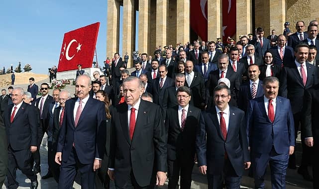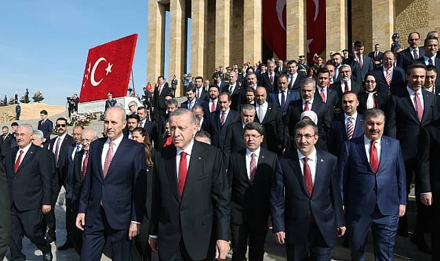 Cumhurbaşkanı Recep Tayyip Erdoğan, muhalefet liderleri ve devlet erkanı Cumhuriyet’in 100. yıl dönümünde Anıtkabir’i ziyaret etti. Erdoğan, Anıtkabir Özel Defteri’ne “Türkiye’yi tarihinin en büyük yatırım hamleleri ile buluşturmuş bir yönetim olarak, ittifak ortaklarımız ve milletimizle birlikte Cumhuriyetimizin ikinci asrını Türkiye yüzyılı ile taçlandırmakta kararlıyız. Cumhuriyetimiz hiç olmadığı kadar güvendedir” mesajını yazdı.Cumhurbaşkanı Recep Tayyip Erdoğan, TBMM Başkanı Numan Kurtulmuş, CHP Genel Başkanı Kemal Kılıçdaroğlu, MHP Genel Başkanı Devlet Bahçeli, İYİ Parti Genel Başkanı Meral Akşener, kuvvet komutanları, bakanlar ve devlet erkanı 29 Ekim Cumhuriyet Bayramı’nın 100. yılında Anıtkabir’i ziyaret etti. Aslanlı Yol’dan başlayan yürüyüşün ardından Gazi Mustafa Kemal Atatürk’ün mozolesine çelenk bırakıldı. Saygı duruşunda bulunulması ve İstiklal Marşı’nın okunmasının ardından Misakı Milli Kulesi’ne geçildi.Erdoğan, Anıtkabir Özel Defteri’ne şu mesajı yazdı. Yazdığı mesajı okuyan Erdoğan, şunları söyledi:“Aziz Atatürk, milletçe ‘En büyük eserim’ dediğiniz Türkiye Cumhuriyeti’nin 100. yıl dönümüne ulaşmanın gurunu ve sevincini yaşıyoruz. Tarihimizin bu önemli dönüm noktasında, zatıalinizi, silah arkadaşlarınızı, gözlerini kırpmadan şehadete koşan aziz şehitlerimizi ve gazilerimizi bir kez daha rahmetle yad ediyoruz.Her bir anı ülkemize ve milletimize hizmet ile geçen 21 yıllık iktidarlarımız döneminde emanetinize hakkıyla sahip çıkmaya çalıştık. Türkiye’yi tarihinin en büyük yatırım hamleleri ile buluşturmuş bir yönetim olarak, ittifak ortaklarımız ve milletimizle birlikte Cumhuriyetimizin ikinci asrını Türkiye yüzyılı ile taçlandırmakta kararlıyız. Cumhuriyetimiz hiç olmadığı kadar güvendedir. Emin ve ehil ellerdedir. Ruhun şad olsun. Cumhuriyetimizin 100. yılı kutlu olsun.”ANITKABİR AVLUSUNDA ERDOĞAN İÇİN YİNE SLOGAN ATILDICumhurbaşkanı Erdoğan ve devlet erkanı, Misakı Milli Kulesi’ne geçerken, Anıtkabir avlusuna alınmış olan ve bariyer arkasında bekleyen bazı sivil kişiler tarafından, “Gençlik seninle gurur duyuyor. Her yer Tayyip, her yer Erdoğan” sloganı atıldı. Erdoğan, Anıtkabir Özel Defteri'ne yazdığı mesajı okurken de "Recep Tayyip Erdoğan" sloganı duyuldu.