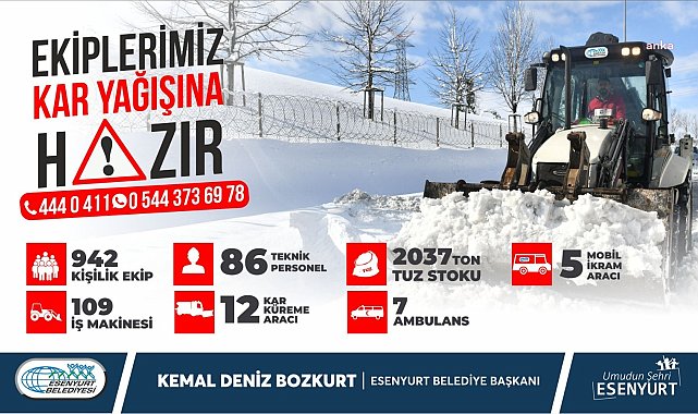Esenyurt Belediyesi, kışa hazırlık çalışmalarını tamamladı. Ekipler, kış şartlarıyla mücadele çalışmalarında 1028 personel, 7 ambulans, 126 araç ve iş makinesi ile görev yapacak.Hava sıcaklığının aniden düşmesiyle birlikte, Esenyurt Belediyesi Afet Koordinasyon Merkezi (AKOM) ilçede kar yağışı ve don olaylarına karşı hazırlıklarını tamamladı. Kışla mücadele çalışmaları kapsamında personel, 126 araç ile belirlenen noktalarda hazır bekliyor. Kar yağışının artması veya aniden bastırması sonucu yolların kapanmaması için 2 bin 37 ton tuz stoku da tedarik edildi. Çalışmalar kapsamında 942 kişilik ekip, 86 teknik personel, 109 iş makinesi, 12 kar küreme aracı, 5 ikram aracı ve 7 ambulans ile 43 mahallede 24 saat boyunca hizmet verilecek."VATANDAŞ ZOR DURUMDA KALMAYACAK"Vatandaşların zor durumda kalmaması için kışa hazırlık çalışmalarını tamamladıklarını söyleyen Belediye Başkanı Kemal Deniz Bozkurt, “Esenyurtluların rahat etmesi, gidecekleri yerlere güvenle ulaşması için personellerimizle birlikte sahada olacağız. Bu çerçevede olumsuz hava koşulları yaşandığı takdirde ilk hedefimiz ana arterlerin daima açık kalmasını sağlamak. Daha sonrasında ise öncelik sırasına göre sağlık ocakları, hastaneler, itfaiye, emniyet gibi kurumlara giden ulaşım yollarını açarak vatandaşların yoğun olduğu yerlerde ulaşımının kapanmamasını sağlayacağız” dedi.