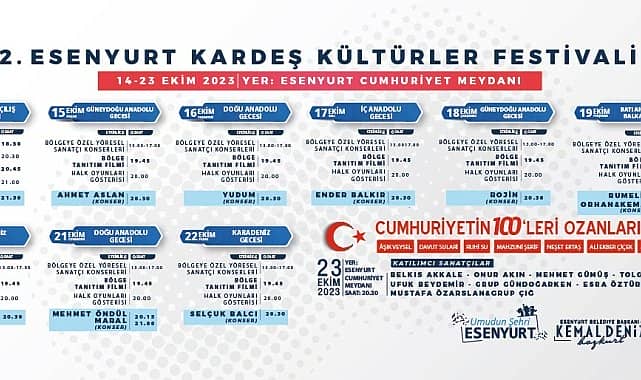 Esenyurt Belediyesi’nin il dernekleriyle birlikte düzenlediği 2. Kardeş Kültürler Festivali, 14 Ekim'de başlıyor. 7 bölgeye özgü yöresel kültürlerin sergileneceği ve bölgesel sanatçıların sahne alacağı festivalde, kurulan zanaatkârlar sokağında unutulmaya yüz tutmuş meslekler de tanıtılacak.Esenyurt’ta ikincisi düzenlenecek olan Kardeş Kültürler Festivali, 14 Ekim’de başlıyor. Esenyurt Belediyesi’nin il dernekleriyle birlikte düzenlediği festival, 23 Ekim'e kadar devam edecek. Esenyurt Cumhuriyet Meydanı’nda gerçekleşecek olan etkinlikte, 44 ilin standı kurulacak ve her gün bir bölgenin tanıtımı yapılarak o bölgeye özgü sanatçılar konser verecek. 10 gün boyunca devam edecek olan festivalde, geleneksel el sanatları stantları ve yörelerin kıyafet kültürü, yemek kültürü ve zanaatlarının gösterileceği zanaatkârlar sokağı kurulacak. Festivalde, halk oyunları, halk âşıkları, mahalli sanatçılar, yöre ozanları ve yörelerin gelenek ve göreneklerini tanıtan programlar yer alacak. Etkinliğin ilk gününde Yeni Belediye Meydanı’nda başlayacak kortej yürüyüşü ve halk oyunları gösterilerinin ardından sanatçı Sevcan Orhan sahne alarak Esenyurtlulara unutulmaz anlar yaşatacak.UNUTULMAYA YÜZ TUTMUŞ MESLEKLER TANITILACAKFestivalde çini ve seramik, sepet örme, lületaşı, kilim dokuma, feretiko bezi dokuma, bıçak ve boynuz tarak yapımı, geleneksel Türk işlemeleri, sıcak cam yapımı ve bakırcılık gibi unutulmaya yüz tutmuş onlarca el emeği ürünün yapımının gösterileceği alanlar yer alacak. Yöresel kültürlerin tanıtılacağı festival alanına her ilin görselleriyle süslenen stantlar kurularak her gün birkaç ilin tanıtımı da yapılacak. Festivalde bu yıl farklı olarak Cumhuriyet’in 100. yılına özel “Cumhuriyetin 100’leri Ozanlarımız” gösterisi düzenlenecek. Etkinliklerin son gününde yapılacak gösteride, usta sanatçılar ünlü halk ozanlarının eserlerini seslendirecek.