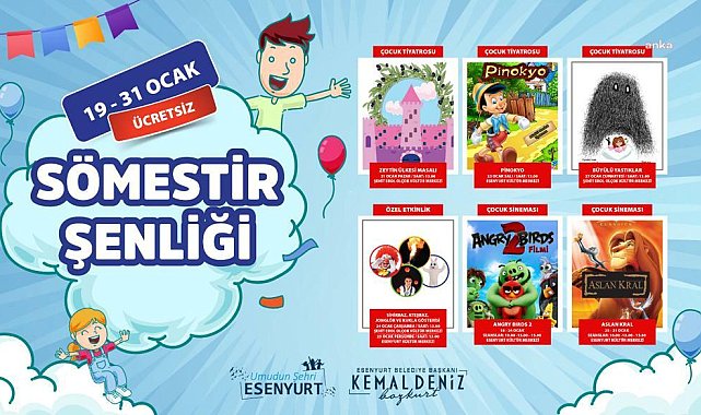 Okulların yarıyıl tatiline girmesiyle birlikte Esenyurt Belediyesi, öğrenciler için “Sömestir Şenliği” düzenleyecek. Beğenilen yapım ve sinema gösterimlerinin yanı sıra programda belediyenin tüm spor tesislerinde toplam 28 alanda kurs hizmeti verilecek.Esenyurt Belediyesi, 2023-2024 eğitim öğretim yılının sömestir tatilinde, ilçedeki öğrencilerin tatillerini daha verimli ve eğlenceli geçirebilmeleri için çalışmalarını tamamladı. 20 Ocak ve 3 Şubat günleri arasında gerçekleştirilecek “Sömestir Şenliği” programında; sihirbaz ve kukla gösterileri, palyaço, maskot, yüz boyama, çocuk tiyatroları ve sinema gösterimleri yer alacak. Belediyenin kültür merkezlerinde düzenlenecek etkinliklerde, çocuklar birinci dönemin yorgunluğunu atarken, keyifli vakit geçirecek.28 SPOR DALINDA EĞİTİMLER VERİLECEKAyrıca belediye bünyesindeki tüm spor merkezlerinde, 7-14 yaş arası çocuklara sömestir tatili boyunca 28 spor alanında eğitimler verilecek. Tatil boyunca istedikleri branşlarda eğitim alan çocuklar, hem tatillerini boş geçirmemiş olacak hem de ilgi duydukları spor dallarında gelişimlerine katkıda bulunmuş olacaklar.