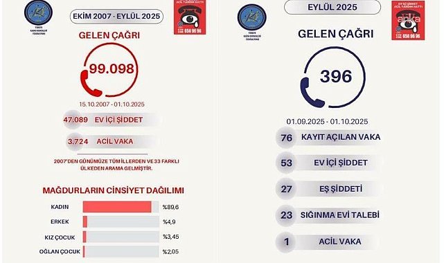 (ANKARA)- Türkiye Kadın Dernekleri Federasyonu’nun (TKDF) “Ev İçi Acil Yardım Hattı Eylül 2025 Veri ve Analiz Raporu”na göre, 1-30 Eylül arasında hattın 396 çağrı aldığı, ihbar edenlerin yüzde 89.7’sinin kadın olduğu ve ihbar nedeninin en çok fiziksel ve psikolojik şiddet olduğu belirtildi. Raporda, hatta 15 Ekim 2007'de itibaren toplamda 99 bin 98 çağrı geldiği bilgisi yer aldı.Türkiye Kadın Dernekleri Federasyonu (TKDF), “Ev İçi Acil Yardım Hattı Eylül 2025 Veri ve Analiz Raporu”nu yayımladı. Raporda, 1-30 Eylül 2025 tarihleri arasında Ev İçi Acil Yardım Hattı’nın 396 çağrı aldığı belirtildi. Bu çağrıların da 41’nin İstanbul’dan, 19’u Ankara, 6’sının da Kocaeli ve İzmirden geldiği tespit edildi.23 çağrıda sığınma talebinde bulunulduRaporda, 2025 Eylül ayı içerisinde Ev İçi Şiddet Acil Yardım Hattı’na ihbarı gelen ve yeni kayıt açılan toplam 76 şiddet vakasının 53'ü ev içi şiddet, 27'sinin kadınların resmi nikahlı oldukları eşleri tarafından maruz bırakıldıkları şiddetin ihbarı olduğu bilgisine yer verildi. 23 çağrıda kadınların sığınma evi talebinde bulundukları ve acil müdahale gerektiren 1 vaka ihbarı olduğuna dikkatin çekildiği raporda; 58 çağrıya hukuki bilgilendirme yapıldığı, 29 çağrının karakola, 5 çağrının ise barolara yönlendirildiği bildirildi.Saldırgan dağılımında en yüksek oran: EşSaldırgan dağılımlarının da en yüksek yüzde 37.3 oranıyla eş, yüzde 11.4 erkek arkadaş, yüzde 7.8 aile ve baba tarafından uygulandığı da tespit edildi.Eylülde hatta gelen ihbarlarda yaş aralığının oranlarına bakıldığında 19-30 yaş arasında yüzde 48.4, 31-40 yaş arasında yüzde 19, 41-48 yaş arasında yüzde 19, 16-18 yaş grubundan da yüzde 13.6 çağrı alındığı bildirildi.Gelen ihbarların yüzde 89.7’si kadınlar tarafından, yüzde 5.3’ünün de erkekler tarafından yapıldığının belirtildiği raporda, ihbarlarda şiddet vakalarının çoğunun fiziksel ve psikolojik şiddet olduğu vurgulandı. Bu kapsamda çağrıların şiddet türlerine göre dağılımının yüzde 40.10'unun psikolojik, yüzde 32.10'unun fiziksel, yüzde 9.88'nin ekonomik, yüzde 9.87'sinin sosyal ve yüzde 7.41'inin cinsel şiddet olduğu vurgulandı.Ayrıca hatta 15 Ekim 2007 itibarıyla toplamda 99 bin 98 çağrı aldığı da raporda yer aldı."Kadınlar en çok en yakınlarındaki erkekler tarafından şiddete uğramaktadır"Raporda şunlar kaydedildi:“Ev İçi Şiddet Acil Yardım Hattı’na gelen çağrılar göstermektedir ki, kadınlar en çok en yakınlarındaki erkekler tarafından şiddete uğramaktadır. Gelen çağrılar kadına karşı şiddetin, en güvenli yer olduğu varsayılan ev içerisinde eşler tarafından uygulandığını göstermektedir. 2025 Eylül ayında, kadınların evli oldukları erkekler yüzde 37.3 ile saldırganlar içerisinde en geniş grubu oluşturmaktadır. Aynı zamanda aile fertleri içerisinde genel anlamda anne, baba, ağabey, kardeşler, kız evlat ve erkek evlat şiddet uygulayanlar olarak maruz kalanlar ya da ihbarda bulunanlar tarafından belirtilmiştir.”