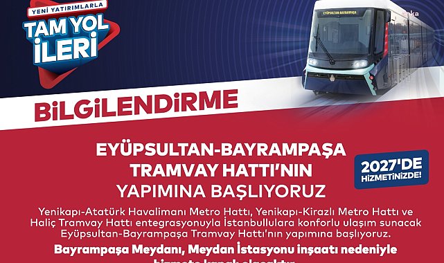 (İSTANBUL)- İstanbul Büyükşehir Belediyesi (İBB), Yenikapı-Atatürk Havalimanı Metro Hattı, Yenikapı-Kirazlı Metro Hattı ve Haliç Tramvay Hattı entegrasyonuyla İstanbullulara yeni bir ulaşım olanağı sunacak Eyüpsultan-Bayrampaşa Tramvay Hattı’nın yapımına başlıyor. Bayrampaşa Meydanı, Meydan İstasyonu inşaatı nedeniyle hizmete kapalı olacak.İBB 3,2 kilometre hat uzunluğu, 5 istasyon, 7,45 dakika yolculuk süresi (tek yön) olan Yenikapı-Atatürk Havalimanı Metro Hattı, Yenikapı-Kirazlı Metro Hattı ve Haliç Tramvay Hattı entegrasyonuyla İstanbullulara yeni bir ulaşım seçeneği sunacak Eyüpsultan-Bayrampaşa Tramvay Hattı’nın yapımına başlıyor. 2027’de hizmete hazır hale gelecek hat için Bayrampaşa Meydanı, Meydan İstasyonu inşaatı nedeniyle hizmete kapalı olacak. İBB, Eyüpsultan-Bayrampaşa Tramvay Hattı’nın yapımına Cumhurbaşkanlığı Yatırım Programı’na alınmadığı için öz kaynaklarla başlıyor.Hattın süreci nasıl ilerledi?İBB'den yapılan açıklamaya göre, hatla ilgili süreç şöyle ilerledi:2022 / Projeler revize edilerek 25 milyon euro tasarruf edildi.Şuşat 2023 / Ulaştırma ve Altyapı Bakanlığı hattın fizibilite ve projelerini onayladı.Ocak 2024 / Cumhurbaşkanlığı Strateji Bütçe Başkanlığı Kamu Yatırım Programı’na almadı.Mart 2024 / İBB kendi öz kaynakları ile hattın yapım-ihale sürecini başlattı.