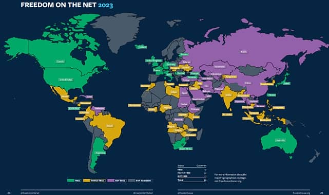 Washington merkezli uluslararası insan hakları kuruluşu Freedom House'un 2023 yılı “İnternette Özgürlük Raporu” yayınlandı. Raporda; geçen yılki rapora göre 32 puandan 30 puana gerileyen Türkiye için “Türkiye'de internet özgürlüğü son on yılda giderek azaldı. Cumhurbaşkanı Recep Tayyip Erdoğan ve iktidardaki AKP, sansürü artıran ve çevrim içi iletişimi suç haline getiren çeşitli yasaları yürürlüğe koydu” değerlendirmesine yer verildi. Uluslararası insan hakları kuruluşu Freedom House; Adrian Shahbaz, Allie Funk ve Kian Vesteinsson tarafından hazırlanan 2023 İnternette Özgürlük Raporu'nu yayınladı. 70 ülkedeki internet özgürlüğüne ilişkin değerlendirmelerin yer aldığı raporda, bu yıl internetin 17 ülkede özgür, 32 ülkede kısmen özgür ve 21 ülkede özgür olmadığı belirtildi.Raporda, Türkiye’de internet kullanımı “Erişim engelleri”, “İçerik kısıtlamaları” ve “Kullanıcı hakları ihlalleri” başlıkları altında incelendi. 100 puan üzerinden yapılan değerlendirmede Türkiye; “Erişim engelleri” başlığında 12 puan, “İçerik kısıtlamaları” başlığında 10 puan ve “Kullanıcı hakları ihlallerinde” 8 puan aldı ve toplam 30 puanla “özgür olmayan ülkeler” kategorisinde yer aldı.Raporda Türkiye için şu değerlendirme yapıldı:“MAYIS 2023 SEÇİMLERİ ÖNCESİNDE DEZENFORMASYON YASASI, SİYASİ MUHALEFET ÜYELERİ VE ELEŞTİRİLER GAZETECİLERİ SUSTURMAK İÇİN KULLANILDI”“Türkiye'de internet özgürlüğü son on yılda giderek azaldı. Cumhurbaşkanı Recep Tayyip Erdoğan ve iktidardaki AKP, sansürü artıran ve çevrimiçi iletişimi suç haline getiren çeşitli yasaları yürürlüğe koydu. Raporun yayınlandığı dönemde Dezenformasyon Yasası yürürlüğe girdi. Bu yasa, internet de dahil olmak üzere yanlış olduğu düşünülen bilgilerin yayılmasına hapis cezası getiriyor. Mayıs 2023 seçimleri öncesinde Dezenformasyon Yasası, siyasi muhalefet üyelerinin yanı sıra eleştirel gazetecileri susturmak için kullanıldı. Ülkede sansür yaygın ve yüzlerce internet sitesi, çevrimiçi makale ve sosyal medya paylaşımı engellenmiş veya kaldırılmıştır. Çevrimiçi trol ağları sıklıkla hükümet yanlısı dezenformasyonu güçlendirmekte ve gazeteciler, aktivistler ve sosyal medya kullanıcıları çevrimiçi içerikleri nedeniyle yasal suçlamalarla karşı karşıya kalmaya devam etmektedir.2002'den bu yana Türkiye'yi yöneten Cumhurbaşkanı Erdoğan ve AKP, son yıllarda giderek otoriterleşti. Anayasal değişiklikler yoluyla ve muhalifler ile eleştirenleri hapse atarak önemli ölçüde güç kazandı. Derinleşen ekonomik kriz ve Mayıs 2023 seçimleri, hükümeti muhalefeti bastırmak ve kamusal söylemi sınırlamak için teşviklendirdi.”“İNTERNET ALTYAPISININ HÜKÜMET ELİNDE MERKEZİLEŞTİRİLMESİ, YETKİLİLERİN ERİŞİMİ KASITLI OLARAK KISITLAMASINA OLANAK SAĞLAMAKTADIR”Raporda; Türkiye'deki duruma ilişkin yer alan bulgulardan öne çıkanlar ise şöyle:“-Bağlantı kısıtlamaları görece seyrek olmakla birlikte, Kasım 2022'de İstanbul'da meydana gelen bombalı saldırı ve Şubat 2023'te yaşanan depremlerin ardından iletişim platformları kısıtlanmıştır. İnternet altyapısının hükümet elinde merkezileştirilmesi, yetkililerin erişimi kasıtlı olarak kısıtlamasına olanak sağlamaktadır.-Başta haberler ve yurttaş gazeteciliği olmak üzere çevrimiçi içeriğin engellenmesi son yıllarda artış göstermiştir. İfade Özgürlüğü Derneği (İFÖD), Aralık 2022 itibariyle 712 binden fazla alan adının ve 150 bin URL'nin engellendiğini tespit etmiştir.Şubat 2023 depremlerinin ardından hükümet, görünüşte dezenformasyonla mücadele etmek için Twitter'a erişimi 8 saat süreyle engelledi. Yetkililer Twitter'ın politika ekibiyle bir araya geldi ve ardından şirketin dezenformasyonu platformdan kaldırmak için yetkililerle işbirliği yapmayı kabul ettiğini duyurdu.-Yaygın olan erişim engellenmesinin yanı sıra, yetkililer içeriğin silinmesini ya da kaldırılmasını talep etme konusunda proaktif davranmaktadır.-Dijital içeriğe yönelik pek çok kısıtlama orantılılık ve şeffaflıktan yoksundur.“CUMHURBAŞKANINA HAKARET SUÇLAMASIYLA AÇILAN ÇOK SAYIDA DAVA SOSYAL MEDYA KULLANICILARI ÜZERİNDE ÖNEMLİ BİR ETKİ YARATMIŞTIR”-Yurttaşlar bloglar ve sosyal medya aracılığıyla Türk siyasetçilerini eleştirebilse de çevrimiçi kullanıcılara yönelik sindirme ve kovuşturmalar birçok kişinin otosansür uygulamasına yol açmıştır. Cumhurbaşkanına hakaret suçlamasıyla açılan çok sayıda dava son yıllarda sosyal medya kullanıcıları üzerinde önemli bir etki yaratmıştır.-Bazı ekonomik kısıtlamalar kullanıcıların çevrimiçi içerik yayınlayabilmelerini olumsuz etkileyebilmektedir. Hükümet, AKP yanlısı çevrimiçi mecraları reklamlar aracılığıyla mali açıdan desteklerken, eleştirel yayınlardan bu desteği esirgemekte ve bağımsız çevrimiçi medyayı dezavantajlı durumda bırakmaktadır.-Bağımsız yayın organlarının kapatılması, hükümet yanlısı medyanın üstünlüğü ve otosansür, çevrimiçi içeriğin çeşitliliğini olumsuz etkilemektedir. Hükümetin büyük medya kuruluşlarına sahip olması ve bunları kontrol etmesi bağımsız gazetecilik için zorluklar yaratmaktadır.-Anayasa, teoride ifade özgürlüğü için geniş korumalar sağlamasına karşın ifade ve basın özgürlüğünü çevrimiçi ortamda koruyamamaktadır.-Ceza kanununun ve Terörle Mücadele Kanunu ile Dezenformasyon Kanunu gibi diğer kanunların birçok hükmü, çevrimiçi faaliyetleri suç haline getirmek için kullanılmaktadır.”