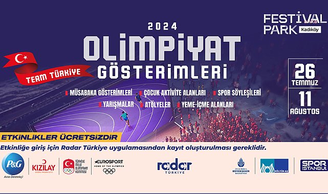 (İSTANBUL) - İstanbul Büyükşehir Belediyesi (İBB) Kültür A.Ş., Spor İstanbul ve Türkiye Milli Olimpiyat Komitesi’nin iş birliğiyle Festival Park Kadıköy'de kurulan 2024 Olimpiyat Gösterimleri alanı, canlı yayınlar ve çeşitli etkinliklerle sporseverleri ağırlıyor. İBB Kültür A.Ş.’nin 2022 yılında kente kazandırdığı multidisipliner açık hava etkinlik mekanı Festival Park Kadıköy, şehrin en canlı etkinliklerine ev sahipliği yapmaya devam ediyor. Mekan, bu kez de 2024 Olimpiyat oyunlarının heyecanını yaşatıyor. İBB Kültür A.Ş.’nin Türkiye Milli Olimpiyat Komitesi ve Spor İstanbul iş birliğiyle düzenlediği gösterimler, 11 Ağustos’a dek Festival Park Kadıköy’ü sporun ve eğlencenin merkezi haline getirecek.P&G'nin ana destekçi olduğu, Kızılay İçecek ve Eurosport’un katkılarıyla gerçekleştirilen etkinlikler kapsamında olimpiyat oyunlarını canlı izleme fırsatının yanı sıra her yaş grubundan sporseverler ve aileler için çeşitli spor aktiviteleri sunuluyor. Alanında uzman konuşmacılar tarafından verilecek spor seminerleri, katılımcılara yenilikçi deneyimler sunacak yaratıcı atölyeler, heyecan verici yarışmalar ve zengin yeme-içme alanları da etkinlikler boyunca devam edecek.Kayıtlar, Radar Türkiye'deFestival Park Kadıköy’de Olimpiyat heyecanını en canlı şekilde yaşamak ve zengin spor aktiviteleriyle keyifli bir gün geçirmek için Radar Türkiye uygulamasından ücretsiz kayıt yaptırılabilecek. Etkinliğin kapı açılış ve kapanış saatleri ise 17.00-23.59 olacak. Festival Park Kadıköy'e ulaşım için ‘https://goo.gl/maps/nMKkmbcmTuNmUCY48’ bağlantısına ulaşılabilecek.