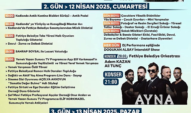 Fethiye Belediyesi'nin ev sahipliğinde düzenlenecek Dastar ve Kuzugöbeği Mantar Festivali, 11 Nisan Cuma günü saat 14.30’da açılış töreniyle başlayacak. Halk oyunları gösterileri, protokol konuşmaları ve Fethiye Belediyesi orkestrasının dinletisiyle renklenecek ilk gün, zeybek gösterisi, resim yarışmaları, fotoğraf sergisi, Kuzugöbeği mantar yemeği yapımı ve sunumu, mercimek köfte, doğa masalları söyleşisi, sokak müzikleri gibi etkinlikler gerçekleşecek.Grup Ayna sahne alacakFestivalin ikinci günü, 12 Nisan'da doğa yürüyüşleri, antik pedal bisiklet sürüşü, Sahrap Soysal ile lezzet yolculuğu, aşçı Elif Korkmazel’in sunuculuğunda Yeşilüzümlü ve yöresi yerel yemek yarışması, 'Sanatla değer bulma' adlı söyleşi, dans gösterisi, yemek atölyeleri ve çocuklara yönelik eğlenceli aktivitelerle dolu etkinlikler yapılacak. Aynı zamanda yerel üreticilerin ve kadın kooperatiflerinin açtığı stantlar da ilgi odağı olacak. Akşam saat 20.00’de Adem Kazan ve Ali Tunç'un ardından saat 21.00’de sevilen grup Ayna sahne alarcak.Son gün coşkusu: Soner Olgun konseri13 Nisan Pazar günü ise doğa yürüyüşleri, mantar toplama etkinlikleri, yerel yemek tadımları ve yarışmalarla sürecek. Gün boyu devam edecek aktivitelerin ardından festivalin finalinde ünlü sanatçı Soner Olgun, sahne performansıyla izleyicilere unutulmaz anlar yaşatacak.