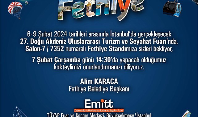 Fethiye, Avrupa’nın en büyük turizm fuarlarından olan Doğu Akdeniz Uluslararası Turizm ve Seyahat Fuarı’ndaki (EMITT) yerini almak için hazırlıklarını tamamladı.Bu yıl 6 ile 9 Şubat günleri arasında İstanbul TÜYAP Fuar ve Kongre Merkezi’nde düzenlenecek EMITT’te, Fethiye standı 7. salonda görücüye çıkacak. Fuarda, Fethiye Belediyesi ile birlikte ilgili oda ve sivil toplum kuruluşlarının yöneticileri ve turizm sektörünün temsilcileri de yer alacak. Fuarda, bölgenin doğal, tarihi ve kültürel zenginliklerinin yanı sıra farklı turizm alternatifleri tanıtılacak. Fethiye standının ziyaretçileri VR gözlükle Babadağ'dan yamaç paraşütü deneyimi yaşayacak.Organizasyon kapsamında Fethiye standında 7 Şubat 2024 Çarşamba günü saat 14.30’da kokteyl verilecek.Geçen yıl Kahramanmaraş merkezli 6 Şubat depremleri nedeniyle gecikmeli olarak nisan ayında düzenlenen EMITT, zor koşullara rağmen, 40 bin civarında sektör profesyoneli ile dünyanın dört bir yanındaki tatil yerlerinin ve seyahat şirketlerinin sunduğu seyahat fırsatlarından faydalanmak isteyen turistleri ağırlamıştı. Fethiye ve Seydikemer’in tüm turizm paydaşlarıyla birlik ve beraberlik içinde temsil edildiği fuarda, Fethiye standı ile birlikte Seydikemer standı yoğun ilgi görmüştü. EMITT 2023’te Fethiye standı ayrıca “En İyi Stand Dekoru” ödülüne layık görülmüştü.