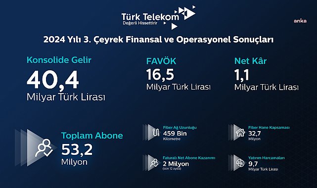 (ANKARA) - Türk Telekom, 2024 yılı üçüncü çeyrek finansal ve operasyonel sonuçlarını açıkladı. Türk Telekom, 2024’ün üçüncü çeyreğinde konsolide gelirlerini, yıllık bazda yüzde 15,9 artışla 40,4 milyar TL'ye yükseltti. Sabit internet ARPU’da yıllık bazda yüzde 21,2'lik artışla beklenen ivmeyi yakalarken, mobil gelir büyümesi güçlü trendini korudu. Türk Telekom’un üçüncü çeyrekteki FAVÖK’ü yıllık bazda yüzde 30,8 artarak yüzde 40,8 marjla 16,5 milyar TL’ye ulaşırken, üçüncü çeyrekteki net karı 1,1 milyar TL oldu. Gelir büyümesinde görülen hızlanma ile FAVÖK ve nakit akışı üretimi önemli ölçüde arttı. Mobil alandaki stratejik yatırımları ve müşteri memnuniyeti odaklı çalışmalarıyla mobil abone sayısını 27 milyona yükselten Türk Telekom, elde ettiği birikimin sonucu olarak 2020’nin ilk çeyreğinden bu yana en büyük hacme ulaşan Mobil Numara Taşıma (MNT) pazarında çeyrek bazında en çok tercih edilen operatör oldu. Mobil alanda yeni bir tarihi rekor seviyeye ulaşan Türk Telekom’un son on iki ayda mobil faturalı net abone kazanımı 2 milyonu aştı. Türkiye’nin 81 ilinin tamamını uçtan uca fiber ağlarla ören Türk Telekom’un, 2024 üçüncü çeyreği itibarıyla fiber altyapı uzunluğu 459 bin kilometreye, fiber hane kapsaması 32,7 milyona, fiber abone sayısı ise 13,4 milyona ulaştı. Fiberdeki gücünü mobile aktararak Fiber Mobilite çağını başlatan Türk Telekom’un, fibere bağlı LTE mobil baz istasyonu oranı ise yüzde 53’e yükseldi. Türk Telekom CEO’su Ümit Önal, konuya ilişkin şunları dile getirdi:“Ülkemizin her noktasında hem fiber hem de mobil teknolojilere hız kesmeden yaptığımız yatırımlarla, dijital dönüşümde öncü rolümüzü sürdürüyoruz. Üçüncü çeyrek pek çok temel performans göstergesinde zirveyi gördüğümüz olağanüstü bir dönem oldu. Bölgemizin teknoloji taşıyıcısı olma ve küresele açılma vizyonumuz kapsamında öncü çalışmalarımız devam ediyor. Üçüncü çeyrek performansımız hedeflerimizi gerçekleştirmek için attığımız kararlı adımların göstergesi. Fiber hane kapsamamız 32,7 milyona yükselirken, fiberin gücünü mobile taşıyarak başlattığımız Fiber Mobilite çağında 27 milyon mobil aboneye ulaştık ve son on iki aylık mobil abone kazanımında tarihi rekorumuzu yeniledik. Yıl sonuna hızla yaklaşırken, Türk Telekom için en az 2024 kadar heyecanlı olacağına inandığımız gelecek yıla hazırlanıyoruz. Faaliyet gösterdiğimiz pazarlardaki konumumuzu daha da güçlendirmek, müşteri deneyimini artırmak ve güçlü finansal performansımızı korumak, yatırımlarımıza devam etmek, değişmez odaklarımız olacak.”Türk Telekom, 2024 yılı üçüncü çeyrek finansal ve operasyonel sonuçlarını duyurdu. Yılın üçüncü çeyreğinde güçlü performansıyla konsolide gelirlerini yıllık bazda yüzde 15,9 artışla 40,4 milyar TL'ye yükselen Türk Telekom’un FAVÖK’ü yılık bazda yüzde 30,8 artışla yüzde 40,8 marjla 16,5 milyar TL’ye ulaştı. Türk Telekom’un 2024 üçüncü çeyreğinde net karı 1,1 milyar TL oldu. Türk Telekom’un 2024 üçüncü çeyrek itibarıyla toplam abone sayısı 53,2 milyon olurken, Türkiye’nin her köşesinde yüksek hızlı internet sunma amacıyla sürdürdüğü çalışmaların sonucunda, fiber ağının uzunluğu 459 bin kilometreye yükseldi. 2024 ikinci çeyrek itibarıyla 32,4 milyon haneyi kapsayan fiber ağ, 2024 üçüncü çeyreğinde 32,7 milyon hane kapsamasına ulaştı.2024 yılı üçüncü çeyreğine dair finansal ve operasyonel sonuçlarını değerlendiren Türk Telekom CEO’su Ümit Önal, şunları kaydetti:“Beklediğimiz üzere üçüncü çeyrek pek çok temel performans göstergesinin zirve yaptığı olağanüstü bir dönem oldu. Gelir büyümesinde öngördüğümüz hızlanma ile birlikte FAVÖK ve nakit akışı üretimi önemli ölçüde arttı. Sabit internet ve mobil, üçüncü çeyrekte operasyonel gelirin yüzde 74,5'ini oluşturdu. Üçüncü çeyrekte sabit ses segmenti dışındaki tüm iş kollarımız, makroekonomik ve diğer zorlukların üstesinden gelmek üzere hayata geçirdiğimiz stratejilerin meyvelerini vermesi ve olumlu etkilerini hissettiğimiz yüksek sezon sayesinde reel gelir büyümesi kaydetti. Bu nedenle, daha önce yüzde 36-38 olan FAVÖK marjı öngörümüzü yüzde 38 olarak güncelliyoruz. Yıl sonuna hızla yaklaşırken, Türk Telekom için en az 2024 kadar heyecanlı olacağına inandığımız gelecek yıla hazırlanıyoruz. Faaliyet gösterdiğimiz pazarlardaki konumumuzu daha da güçlendirmek, müşteri deneyimini artırmak ve güçlü finansal performansımızı korumak, yatırımlarımıza devam etmek, değişmez odaklarımız olacak.”Uzun zamandır izledikleri stratejinin sonucu olarak mobilde yine üstün bir performans sergilediklerini vurgulayan Ümit Önal, şöyle devam etti:“Mobilde 27 milyon aboneye ulaştık”“Müşteri memnuniyeti odaklı çalışmalarımız ve doğru yatırımlarla büyümeye devam eden mobil segmentte bu çeyrekte de kayda değer sonuçlar elde ettik. 651 bin net abone kazanan mobil segment toplamda 27 milyonluk bir müşteri kitlesine ulaştı. Faturalı segment önceki iki çeyrekteki güçlü performansını aşarak 568 bin net abone kazandı. Tarihi rekorunu tazeleyen faturalı segment son on iki aylık net abone kazanımında ilk kez toplamda 2 milyonu aştı. Kapsama ve kapasite olarak mobildeki konumumuzu günden güne güçlendirmeye devam ediyoruz. 4.5G ihalesi sonrası frekans sahipliğimizi 3 katına çıkardık. Hız için önemli olan abone başı frekansta ve 5G için de kritik öneme sahip 1800 Mhz frekans sahipliğinde pazar lideriyiz. Temmuz ayında elde ettiğimiz tarihi yüksek aylık net abone kazanımı sayesinde üçüncü çeyrekte MNT pazarındak