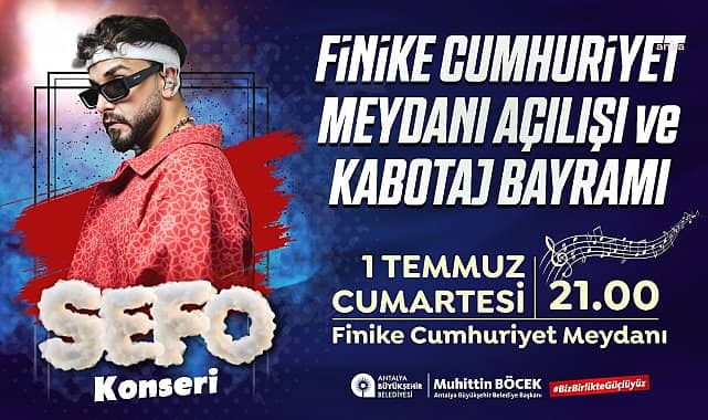 Antalya Büyükşehir Belediyesi tarafından yapımı gerçekleştirilen Finike Cumhuriyet Meydanı ve Rekreasyon Alanı, 1 Temmuz Kabotaj Bayramı’nda Sefo konseri ile açılıyor. Antalya Büyükşehir Belediye Başkanı Muhittin Böcek’in Finike'ye modern bir yaşam alanı kazandırma hedefiyle başlattığı Finike Cumhuriyet Meydanı ve Rekreasyon Alanı Projesi tamamlandı. Finike’ye yakışacak Cumhuriyet Meydanı, 1 Temmuz Cumartesi günü ünlü sanatçı Sefo konseri ile açılacak.MODERN BİR YAŞAM ALANI İlçenin yeni simgesi ve modern bir yaşam alanı olacak Finike Cumhuriyet Meydanı’nda, Atatürk Anıtı ve sahil bandı ile bütüncül olarak bir kentsel tasarım projesi gerçekleştirildi. 14 bin metrekare sert zemin, 8 bin metrekare yeşil alandan oluşan projede meydan, seyir terasları, oturma alanları, gölgelikler, satış birimleri, çocuk oyun alanları, mescit, tuvalet, yürüyüş yolu ve peyzaj düzenlemeleri yer alıyor.SEFO COŞKUSU YAŞANACAK Ünlü rap sanatçısı Sefo, 1 Temmuz Kabotaj Bayramı kutlamaları ve açılış çerçevesinde 1 Temmuz Cumartesi günü saat 21.00’de Finike Cumhuriyet Meydanı’nda konser verecek.