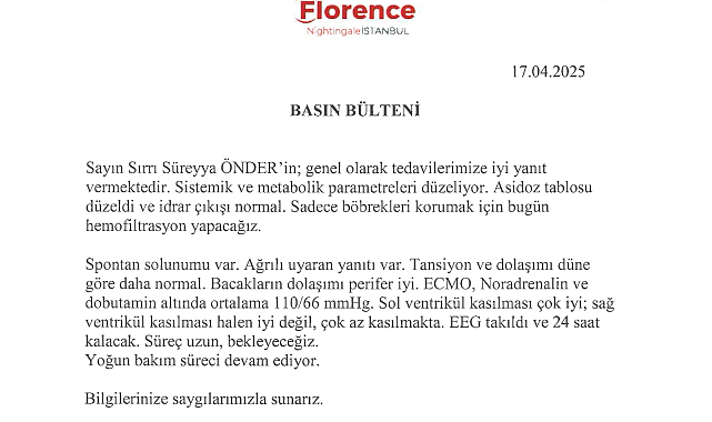 (İSTANBUL) - Florence Nightingale İstanbul Hastanesi, TBMM Başkanvekili ve DEM Parti İmralı Heyeti üyesi Sırrı Süreyya Önder'in tedavilere iyi yanıt verdiğini belirterek, ''Sol ventrikül kasılması çok iyi; sağ ventrikül kasılması halen iyi değil, çok az kasılmakta. EEG takıldı ve 24 saat kalacak. Süreç uzun, bekleyeceğiz. Yoğun bakım süreci devam ediyor'' açıklamasını yaptı.Kalpten çıkan ana damarında meydana gelen yırtılma nedeniyle İstanbul'da 12 saat süren ameliyatın ardından DEM Partili TBMM Başkanvekili Sırrı Süreyya Önder'in güncel sağlık durumuna ilişkin Florence Nightingale İstanbul Hastanesi, Önder'in sağlık durumuna ilişkin açıklama yaptı. Açıklamada, şunlar kaydedildi:''Sayın Sırrı Süreyya Önder; genel olarak tedavilerimize iyi yanıt vermektedir. Sistemik ve metabolik parametreleri düzeliyor. Asidoz tablosu düzeldi ve idrar fikisi normal. Sadece böbrekleri korumak için bugün hemofiltrasyon yapacağız.Spontan solunumu var. Ağrılı uyaran yanıtı var. Tansiyon ve dolaşımı düne göre daha normal. Bacakların dolasimi perifer iyi. ECMO, Noradrenalin ve dobutamin altında ortalama 110/66 mmHg. Sol ventrikül kasılması çok iyi; sağ ventrikül kasılması halen iyi değil, çok az kasılmakta. EEG takıldı ve 24 saat kalacak. Süreç uzun, bekleyeceğiz. Yoğun bakım süreci devam ediyor. Bilgilerinize saygılarımızla sunarız.''
