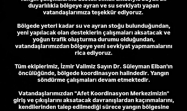 “Vatandaşlarımızdan Afet Koordinasyon Merkezimizin giriş ve çıkışlarını aksatacak davranışlardan kaçınmalarını, kendilerinden talep edilmediği sürece yangın bölgesine yaklaşmamaları ve bölgeden uzak durmalarını rica ediyoruz.”
