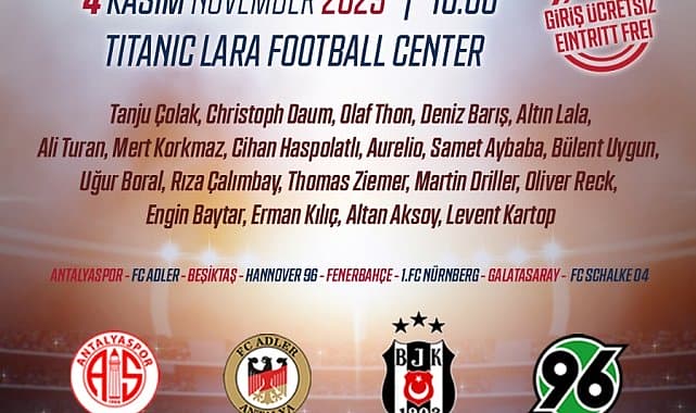 Antalya Büyükşehir Belediyesi ve Almanya Federal Cumhuriyeti Ankara Büyükelçiliği iş birliğiyle gerçekleştirilen ‘Efsaneler Kupası’ futbol turnuvası bu yıl sekizinci kez düzenlenecek. 4 Kasım’da yapılacak turnuvaya, Tanju Çolak, Christoph Daum, Rıza Çalımbay, Aurelio gibi ünlü futbolcular katılacak.Türkiye ve Almanya’nın tanınmış ve efsaneleşmiş 38 yaş üstü veteran oyuncularından oluşan futbol takımları, Türk-Alman dostluğunu vurgulamak amacıyla bir kez daha Antalya’da buluşuyor. Türk-Alman Dostluk Günü etkinlikleri kapsamında düzenlenecek olan 8. Efsaneler Kupası, Antalya Büyükşehir Belediyesi ve Almanya Federal Cumhuriyeti Ankara Büyükelçiliği ev sahipliğinde 4 Kasım Cumartesi günü gerçekleştirilecek. ‘Efsaneler Kupası bu yıl da Türk ve Alman futbolunun efsane isimlerini bir araya getirecek. Antalya’da futbol şöleni yaşatacak turnuva Titanic Lara Football Center’de yapılacak. EFSANE FUTBOLCULAR SAHADATurnuvaya Antalyaspor, Galatasaray, Beşiktaş, Fenerbahçe, Hannover 96, 1. FC Nürnberg, Schalke 04 ve FC Adler takımları katılıyor. 4 Kasım Cumartesi günü saat 10.00’da başlayacak olan turnuvaya giriş ve katılımlar ücretsiz olacak. Maçlarda Tanju Çolak, Christoph Daum, Olaf Thon, Deniz Barış, Altin Lala, Ali Turan, Mert Korkmaz, Cihan Haspolatlı, Aurelio, Samet Aybaba, Bülent Uygun, Uğur Boral, Rıza Çalımbay, Thomas Ziemer, Martin Driller, Oliver Reck, Engin Baytar, Erman Kılıç, Altan Aksoy, Levent Kartop gibi isimler sahada yer alacak.