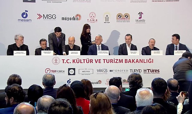 (İSTANBUL)- Kültür ve Turizm Bakanı Mehmet Nuri Ersoy’un katılımıyla, ilgili kurumların başkanlarının da hazır bulunduğu, 2023 yılında konaklama tesisleriyle ilk adımı atılan "Müzik Lisansına İlişkin İş Birliği Protokolü", gastronomi tesisleri ile müzik meslek birlikleri arasında da imzalandı.Kültür ve Turizm Bakanı Mehmet Nuri Ersoy’un katılımıyla, ilgili kurumların başkanlarının da hazır bulunduğu törenle; 2023 yılında konaklama tesisleriyle ilk adımı atılan "Müzik Lisansına İlişkin İş Birliği Protokolü, gastronomi tesisleri ile müzik meslek birlikleri MSF, MÜZFED, TÜROB, TÜROFED, TURYİD, TÜRES, MESAM, MSG, MÜYORBİR, T.S.M.B., MÜ-YAP, MÜYA-BİR ve MÜZİKBİR arasında İstanbul'daki Atatürk Kültür Merkezi'nde imzalandı.Protokol ile 40 yıllık sorunun çözüldüğü, restoran, kafe, eğlence tesisi gibi işletmelerin yıllardır süren telif ihtilaflarının son bulacağı, müzik ve gastronomi sektörünün kazanacağı belirtildi. Protokolle, TURYİD ve TÜRES üyesi işletmeler, ortalama yüzde 70 indirimli tarife bedelleriyle tek elden kolayca müzik lisansı alabilecek. Protokolle, gastronomi tesisleri için telif lisansı kolaylaştığı, Kültür ve Turizm Bakanlığı himayesinde, müzik meslek birlikleri ile gastronomi sektörü arasında telif lisansı konusunda uzlaşı sağlandığı, yargı ihtilaflarının sona erdiği, müzik lisans belgesi uygulaması ile otel sektöründeki 5 bin hukuki işlemin sıfıra indiği belirtilerek, aynı başarının gastronomi sektöründe de hedeflendiği kaydedildi.