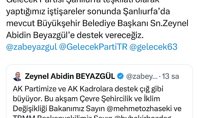 Gelecek Partisi İl Başkanı Hidayet Baysal yaptığı paylaşımda, "Gelecek Partisi Şanlıurfa teşkilatı olarak yaptığımız iştişareler sonunda Şanlıurfa’da mevcut Büyükşehir Belediye Başkanı Sn.Zeynel Abidin Beyazgül’e destek vereceğiz" dedi.