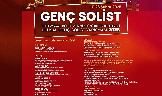 (İZMİR)- Genç opera solistlerinin Türkiye ve dünyadaki sanat kurumlarının kapılarını aralama fırsatı buldukları Ulusal Genç Solist Yarışması, bu yıl 17-23 Şubat arasında iki ayrı kategoride İzmir Büyükşehir Belediyesi Ahmed Adnan Saygun Sanat Merkezi’nde (AASSM) yapılacak. Yarışmanın final bölümü halka açık ve ücretsiz olacak.İzmir Büyükşehir Belediyesi, Rotary Bölge 2440 ve Dokuz Eylül Üniversitesi Devlet Konservatuvarı iş birliği ile 17-23 Şubat tarihlerinde Ulusal Genç Solist Yarışması düzenlenecek. İzmir Büyükşehir Belediyesi Ahmed Adnan Saygun Sanat Merkezi’nde (AASSM) yapılacak bu önemli yarışmayla genç opera solistlerinin hem sanatseverlere tanıtılması hem de Türkiye ve dünyadaki sanat kurumlarının kapılarını aralama olanaklarını bulması amaçlanıyor. Önemli isimlerin yer aldığı jüri, şehir dışından ve Kuzey Kıbrıs Türk Cumhuriyeti’nden (KKTC) gelen 102 genç sanatçı arasından seçim yapacak. İki ayrı kategoride düzenlenecek yarışmada, final bölümü halka açık ve ücretsiz olacak.Final 22 ve 23 Şubat’ta