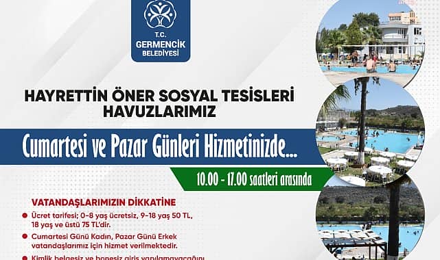 Germencik Belediyesi, Ortaklar Hayrettin Öner Sosyal Tesisleri Yüzme Havuzları hizmete açıldı. Hafta içi çocuklara yüzme kursu verilen havuzlardan, hafta sonu da vatandaşlar faydalanacak.Ortaklar Hayrettin Öner Sosyal Tesisleri'nin içerisinde yüzme havuzlarının yanı sıra soyunma odası, ilk yardım alanı, kafeterya ve halı saha ile antrenör ve can kurtaran da bulunuyor. Cumartesi günü kadınlara, pazar günleri de erkeklere hizmet verecek olan yüzme havuzlarında girişte, kimlik belgesi ve bone zorunluluğu bulunuyor. Havuzlar hafta sonu saat 10.00 ile 17.00 saatlerinde hizmet verecek. Tesislerdeki imkanlardan faydalanmak isteyen vatandaşlar için ücret tarifesi 0-8 yaş arası ücretsiz, 9-18 yaş arası 50 lira, 18 yaş ve üstü vatandaşlar için ise 75 lira olacak.“HAVUZLARIMIZ HAFTA SONU VATANDAŞLARIMIZIN HİZMETİNDE”Germencik Belediye Başkanı Fuat Öndeş, “Germencik Belediyesi olarak vatandaşlarımızın bunaltan yaz sıcaklarında serinlemesi ve keyifli vakit geçirmeleri için Ortaklar’da bulunan Hayrettin Öner Sosyal Tesisleri havuzlarımızı bu yaz da hizmete açtık. Zaten havuzlarımız çocuklarımız için hazırladığımız yaz okulu kapsamında hafta içi yüzme kursuna ev sahipliği yapmaktadır. Hafta sonu da vatandaşlarımızın hizmetine sunmak için havuzlarımızı hazırladık. Çalışmalarımıza aralıksız devam edeceğiz. Şimdiden tesislerimize gelecek olan tüm vatandaşlarımıza iyi eğlenceler ve keyifli vakit geçirmelerini diliyorum” dedi.