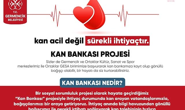 Germencik Belediyesi, oluşturduğu “Kan Bankası” projesiyle, kan ihtiyacı bulunan kişiyle kan bağışçısını bir araya getirecek. Belediye Başkanı Fuat Öndeş, “Amacımız bankamıza başvurup, bilgi havuzuna kaydolan gönüllü bağışçılarımız ile kan arayan vatandaşlarımızı bir araya getirmek” dedi.Germencik Belediyesi, acil kan ihtiyacı olan ve kan bağışında bulunmak isteyen vatandaşlara kolaylık sağlamak için “Kan Bankası” projesini hayata geçirdi. Kan Bankası’na kaydolan vatandaşların kan grubu sisteme işlenecek, ihtiyaç durumunda kan arayan vatandaşlarla, bilgi havuzundaki gönüllü bağışçılar bir araya getirilecek. Projeyle gerekli irtibat sağlanarak kan talebinin hızlıca karşılanması amaçlandı.AMAÇ VAKİT KAYBINI EN AZA İNDİRMEKGermencik Belediye Başkanı Fuat Öndeş, sosyal sorumluluk projelerine büyük önem verdiklerini vurgulayarak, şöyle dedi:“Germencik Belediyesi olarak sosyal sorumluluk alanında projeler uygulamaya büyük önem veriyoruz. Ancak bunlar arasında kan gibi hayati bir öneme sahip konuda hassas bir çalışma başlattık. Emsalleri vardır ancak ne olursa olsun, hepimizin ihtiyaç duyacağı bir konuda bizler de böyle bir çalışma yapmak istedik. Amacımız bankamıza başvurup, bilgi havuzuna kaydolan gönüllü bağışçılarımız ile kan arayan vatandaşlarımızı bir araya getirmek, dolayısıyla acil bir durumda vakit kaybını en aza indirmektir.”"SİZ DE HAYAT KURTARABİLİRSİNİZ"Gönüllü bağışçı olmak isteyen vatandaşlar, Germencik ve Ortaklar Mahallesi’ndeki Kültür, Sanat ve Spor merkezleri ile GESA birimine başvurarak, Kan Bankası’na kaydolabiliyor.