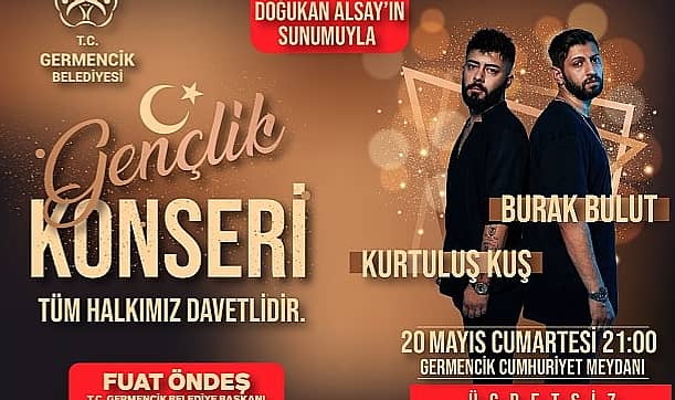 Germencik’te 19 Mayıs Atatürk’ü Anma, Gençlik ve Spor Bayramı, her yıl olduğu gibi bu yıl da çeşitli etkinliklerle kutlanacak. Germencik Belediye Başkanı Fuat Öndeş, Aydınlıları Kurtuluş Kuş ve Burak Bulut’un sahne alacağı konsere davet etti.Germencik’te 19 Mayıs kutlamaları, halk arasında Kavak Meydanı olarak bilinen Şehit Cafer Sokak’ta kortej yürüyüşü ile başlayacak. Cumhuriyet Meydanı’nda son bulacak kortej yürüyüşünün ardından, interaktif şovmen Doğukan Alsay’ın sunumuyla ünlü sanatçılar Kurtuluş Kuş ile Burak Bulut sahnede olacak. Aydınlıları 20 Mayıs Cumartesi günü saat 20:00’de düzenlenecek etkinliklere davet eden Germencik Belediye Başkanı Fuat Öndeş, şunları söyledi:“Haydi Germencik, milli mücadele ateşinin yanmaya başladığı gün olan 19 Mayıs Atatürk'ü Anma Gençlik ve Spor Bayramı'mızın manasına yakışır bir şekilde 20 Mayıs Cumartesi Germencik Cumhuriyet Meydanı'nda gerçekleşecek olan ünlü sanatçılar Kurtuluş Kuş ve Burak Bulut konserimizde buluşuyor, bayramımızı coşku içerisinde kutluyoruz. Etkinlik programımız saat 20:00'de, yapımını tamamladığımız Şehit Cafer Sokak'ta düzenleyeceğimiz kortej yürüyüşü ile başlayacaktır.”