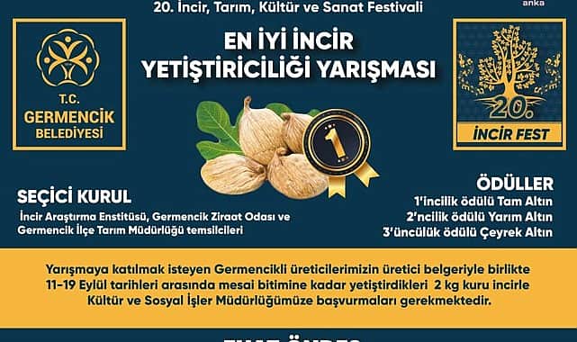 Sosyal İşler Müdürlüğü’ne teslim etmesi gerekiyor.ALTINLA ÖDÜLLENDİRİLECEKYarışma sonunda 1’inci tam altın, 2’nci yarım altın ve 3’üncü de çeyrek altın ile ödüllendirilecek. Germencikli incir üreticilerini yarışmaya davet eden Belediye Başkanı Fuat Öndeş, “İncirimizin katma değerini artırmak ve markalaşmasını sağlayarak üreticilerimizin emeğinin tam karşılığını almaları hedefiyle bu anlamda tanıtım çalışmalarımıza büyük önem veriyoruz. Bu çerçevede bu yıl da gerçekleştireceğimiz 20. İncir, Tarım, Kültür ve Sanat Festivalimizin bir parçası olarak düzenleyeceğimiz en iyi üreticisi yarışmasıyla hem incirin ana vatanı olan ilçemizin adını duyuracak hem de bu öneme yakışır dünyanın en kaliteli incirinin Germencik’te yetiştiğini gösterme fırsatı bulacağız. İlçemiz sınırları içerisinde yaşayan ve yarışma koşullarını sağlayan tüm üreticilerimizi yarışmamıza davet ediyorum. Bu aslında her ne kadar bir yarışma olsa da belirttiğim gibi ana amacı ve hedefi incirimizin önem ve kıymetini ön plana çıkarmaktır. Şimdiden tüm üreticilerimize başarılar diliyorum” dedi.22 Eylül Cuma günü başlayıp 24 Eylül Pazar günü sona erecek olan festivalin ilk gününde İrem Derici, ikinci gününde Ömer Faruk Bostan, üçüncü gününde ise Haluk Levent sahne alacak.