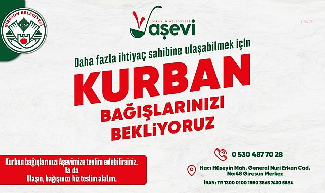 (GİRESUN) - Giresun Belediyesi, Kurban Bayramı’nda bağışlanan etleri aşevinde işleyerek yıl boyunca ihtiyaç sahibi vatandaşlara sıcak yemek olarak ulaştıracak.Giresun Belediyesi, Kurban Bayramı’nda vatandaşlardan gelen kurban bağışlarını kabul ederek, etleri hijyenik koşullarda aşevinde işleyip yıl boyunca ihtiyaç sahibi, yaşlı, hasta ve engelli vatandaşlara sıcak yemek olarak ulaştıracak. Bağış yapmak isteyenler, 0530 487 70 28 numaralı Aşevi Destek Hattı’nı arayabilecek.Belediye Başkanı Fuat Köse, "Kurban Bayramının paylaşma ruhunu hep birlikte yaşamak istiyoruz. Toplumun her kesimine eşit hizmet etmek ve ihtiyaç sahiplerine destek olmak belediyemizin öncelikli görevlerinden biridir. Vatandaşlarımızın bağışları ile sofralara sıcak bir tabak yemek götürmekten büyük mutluluk duyuyoruz" dedi.