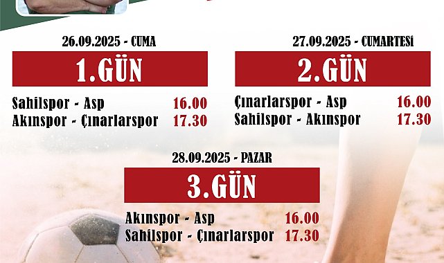 (GİRESUN)- Giresun Belediyesi, gençleri spora teşvik etmek ve sağlıklı yaşamı desteklemek amacıyla plaj futbolu turnuvası düzenliyor.Giresun Belediyesi, plaj futbolu turnuvası başlatıyor. Sahilspor, Akınspor, Çınarlarspor ve ASPspor takımlarının mücadele edeceği turnuva, tek devreli lig usulüne göre oynanacak. Giresun Belediyesi emekli personeli ve Giresun amatör sporuna uzun yıllar hizmet eden Süleyman Özyazıcı (Bodimeli) anısına düzenlenen turnuva, 26 Eylül Cuma günü başlayacak ve 28 Eylül Pazar günü sona erecek. Müsabakalar her gün 16.00 ve 17.30 saatlerinde gerçekleştirilecek. Turnuva sonunda dereceye giren takımlara kupa ve çeşitli ödüller verilecek.