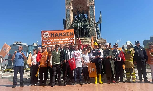 Kamu Çalışanları Hak Sendikaları Konfederasyonu (HAK-SEN), 1 Mayıs Emek ve Dayanışma Günü'nü Taksim’de kutladı. Taksim Atatürk Anıtı'na çelenk bırakan HAK-SEN Genel Başkanı Ayhan Çivi ve berberindeki heyet, 1 Mayıs 1977 yılında hayatını kaybeden vatandaşların anısına karanfil bıraktı. İmam kıyafeti giyen bir kişi, "Enflasyon altında, artan kira fiyatları karşısında ezilen, personelinden daha düşük maaş alan memurlar ne yazık ki vefat etmiştir" diyerek gıyabi cenaze namazı kıldırdı.HAK-SEN heyeti, 1 Mayıs Emek ve Dayanışma Günü'nü kutlamak ve taleplerini sıralamak üzere, işçi kıyafetleriyle Taksim Meydanı'na gelerek Cumhuriyet Anıtı'na çelenk bıraktı ve basın açıklaması yaptı. HAK-SEN Genel Başkanı Çivi'nin konuşmasının ardından imam kıyafeti giyen bir kişi, memurlar için gıyabi cenaze namazı kıldırdı."VEFAT EDECEK DURUMA GELDİK"Heyete "Memuru nasıl bilirsiniz" diye soran sözde imam, "Yoksul biliriz" yanıtını aldı. "Allah rahmet eylesin, ruhuna el Fatiha" diyen sözde imam, sözlerini şöyle sürdürdü:"Enflasyon altında, artan kira fiyatları karşısında ezilen, markete gittiği zaman aldığı ürünü üç kere düşünen, çalıştırdığı personelden daha düşük maaş alan memurlar ne yazık ki vefat etmiştir. İşçilere yapılan iyileştirme, emeklilere yapılan iyileştirme, işçilere verilen ikramiye, devletin itibarını ve onurunu temsil eden devlet memurlarına yapılmayanlardan dolayı mağdur olmuş ve vefat edecek duruma gelmişizdir.İşçiye yapılan, emekliye yapılan, esnafa yapılan, sanayiciye yapılan iyileştirmelerden mahrum bırakılmışızdır. Devlet memurlarının da bir an önce iyileştirmeyle bir nebze olsun ayağa kaldırılmasını bu anlamlı günde talep ediyoruz."