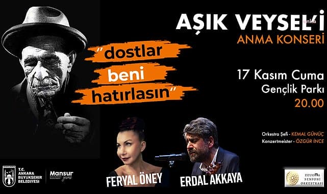 Aşık geleneğinin en büyük temsilcilerinden halk ozanı Aşık Veysel Şatıroğlu, vefatının 50. yılında Ankara Büyükşehir Belediyesi tarafından düzenlenecek program ile anılacak. 17 Kasım 2023 tarihinde saat 20.00’de Gençlik Parkı’nda gerçekleştirilecek ‘Dostlar Beni Hatırlasın’ adlı anma töreninde Feryal Öney ile Erdal Akkaya sahne alacak.