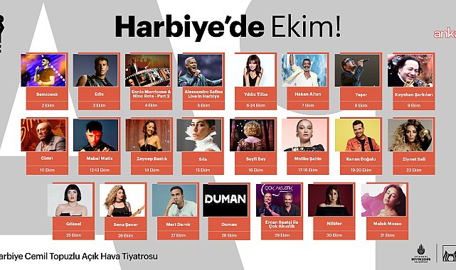 (İSTANBUL)- İstanbul’un simge mekânlarından Harbiye Cemil Topuzlu Açık Hava Tiyatrosu, ekim ayında da müzik ve eğlencenin adresi olacak. Ay boyunca sahnelenecek konserler ve gösteriler, sanatseverlere keyifli ve unutulmaz anlar yaşatacak.Dünya çapında ünlü sanatçılardan Türk müziğinin sevilen isimlerine uzanan geniş program, İBB Kültür A.Ş’ye bağlı Harbiye Açık Hava’nın keyifli atmosferinde izleyicilerle buluşacak. Konserler, özel projeler ve eğlenceli performanslarla dolu takvim, İstanbul’un kültür sanat yaşamına renk katacak. Etkinliklere ait biletler Passo, Biletix, Biletinial’da satışa çıkacak. Gençler Koltuk Senin ile ekim ayında da etkinliklerle ücretsiz buluşacakHarbiye Açık Hava’da Kültür A.Ş. ve kültür sanat sektörü iş birliğiyle hayata geçirilen "Koltuk Senin" uygulaması ile boş koltuk kalmıyor. 24 yaş ve altı gençlere kültür sanat etkinliklerinden ücretsiz faydalanma fırsatı sunan "Koltuk Senin", Harbiye Cemil Topuzlu Açık Hava Tiyatrosu’nda gerçekleştirilen etkinliklerde boş koltukları ücretsiz olarak gençlerle buluşturmaya devam edecek.Nasıl Yararlanılır?-Koltuk Senin standı etkinlik saatinden 1 saat önce açılır.-Girişte bulunan "Koltuk Senin" bilgilendirici totemi üzerinde yer alan QR kod ile Radar Türkiye uygulaması indirilir.-Bekleyen katılımcılar kendi oluşturdukları sıraya göre işleme alınır.-Etkinlik başladıktan sonra boş koltuk olması durumunda alınan sıra numarasına göre 24 yaş ve altı gençler içeri alınır ve görevliler tarafından uygun koltuklara yönlendirilir.-İstanbul Harbiye Cemil Topuzlu Açık Hava Tiyatrosu’nun tüm etkinlik programına ve bilet satış platformlarına Radar Türkiye uygulamasındaki “Harbiye” sekmesinden ulaşılabilir.Program şu şekilde:-1 Ekim 2025 - Bir Baba Hamlet-2 Ekim 2025 - Semicenk-3 Ekim 2025 - Edis-4 Ekim 2025 - Ennio Morricone &Nino Rota - Part 2-5 Ekim 2025 - Alessandro Safina Live in Harbiye-6 Ekim 2025 - Yıldız Tilbe-7 Ekim 2025 - Hakan Altun-8 Ekim 2025 - Yaşar-9 Ekim 2025 - Kayahan Şarkıları-10 Ekim 2025 - Cimri-11 Ekim 2025 - Ajda Pekkan-12-13 Ekim 2025 - Mabel Matiz-14 Ekim 2025 - Zeynep Bastık-15 Ekim 2025 - Sıla-16 Ekim 2025 - Seyfi Bey-17-18 Ekim 2025 - Melike Şahin-19-20 Ekim 2025 - Kenan Doğulu-23 Ekim 2025 - Ziynet Sali-25 Ekim 2025 - Göksel-26 Ekim 2025 - Sena Şener-27 Ekim 2025 - Mert Demir-28 Ekim 2025 - Duman-29 Ekim 2025 - Ercan Saatçi ile Çok Akustik-30 Ekim 2025 - Nilüfer-31 Ekim 2025 - Melek Mosso