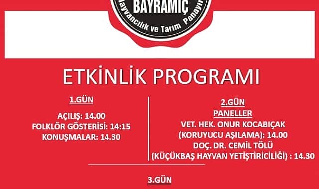 Bayramiç Hayvancılık ve Tarım Panayırı, 15-16-17 Eylül günlerinde kapalı pazar yerinde gerçekleşecek. Yoğun bir programa sahip olan panayırın büyük ilgi görmesi bekleniyor.Bayramiç, 15-16-17 Eylül günlerinde kapalı pazar yerinde gerçekleşecek Hayvancılık ve Tarım Panayırı'na hazırlanıyor. Bayramiç Belediyesi, Bayramiç Ziraat Odası, Çanakkale Ticaret ve Sanayi Odası, Çanakkale Ticaret Borsası, Bayramiç Süt Üreticileri Birliği ve Bayramiç Kırmızı Et Üreticileri Birliği ortaklığında yapılacak etkinlik, yoğun programıyla dikkat çekiyor.15 Eylül Cuma günü saat 14.00’te açılışı yapılacak panayır, folklor gösterisi ve protokol konuşmalarıyla devam edecek. İkinci gün yine saat 14.00’te Veteriner Hekim Onur Kemal Kocabıçak, koruyucu aşılama; Doç. Dr. Cemil Tölü ise küçükbaş hayvan yetiştiriciliği hakkında düzenlenen panelde bilgi verecek. Panayırın son günü saat 13.00’te çeşitli ırklarda koyun ve keçiler arasında güzellik yarışması yapılacak. Üç gün boyunca stantlar açık olacak. Tarım ve hayvancılıkla ilgili firmalar, stantlarda yerlerini alarak ürünlerini tanıtacak ve halka bilgilendirmede bulunacak.