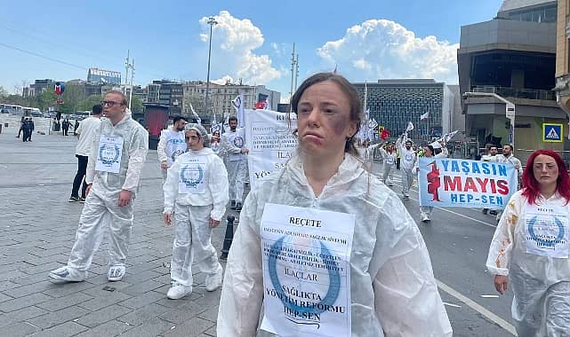 HEP-SEN Başkanı Yunus Şimşek, "Ortaçağ'da milyonlarca insanın hayatına mal olmuş kara veba bitmedi. Bir çağ sonra, 21. yüzyılın 2023'ünde Türkiye'de, kamu emekçilerinin üzerine kara bulut gibi çöktü. Semptomları biraz daha farklı. Peki çağımızın kara vebası nedir? Sağlık sistemidir" dedi.Hemşireler ve Tüm Sağlık Profesyonelleri Sendikası (HEP-SEN), '1 Mayıs Emek ve Dayanışma Günü'nde kalabalık bir grupla, yüzlerinde şiddet gördüklerine işaret eden morluklar, üzerlerinde tulumlar ve göğüslerinde sağlık sisteminin hastalığını simgeleyen reçetelerle Taksim Cumhuriyet Anıtı'na çelenk bıraktı. HEP-SEN Başkanı Yunus Şimşek, "Orta Çağ'da milyonlarca insanın hayatına mal olmuş kara veba bitmedi. Bir çağ sonra, 21. yüzyılın 2023'ünde Türkiye'de, kamu emekçilerinin üzerine kara bulut gibi çöktü. Semptomları biraz daha farklı. Peki çağımızın kara vebası nedir? Sağlık sistemidir" dedi.İstanbul'da '1 Mayıs Emek ve Dayanışma Günü' dolayısıyla Taksim Meydanı'na birçok sendika ve sivil toplum kuruluşundan heyetler gelerek Cumhuriyet Anıtı'na çelenk bıraktı. HEP-SEN üyeleri de anıta çelenk bıraktıktan sonra "Cesur korkusuz HEP-SEN meydanda" sloganları atarak Kazancı Yokuşu'na yürüdü. 1971'de burada öldürülenler için karanfil bırakılmasından sonra grup adına HEP-SEN Genel Başkanı Yunus Şimşek açıklama yaptı.Sağlık sisteminin genel durumunu, çalışanların yaşadığı sorunları Orta Çağ’da insanlığı kıran kara vebaya benzeten Şimşek, şunları söyledi:"KARA VEBA, KAMU ÇALIŞANLARININ ÜZERİNE BİR KARA BULUT GİBİ ÇÖKTÜ: Kara veba daha bitmedi. Orta Çağ'da milyonlarca insanın hayatına mal olmuş kara veba, bitmedi. Bir çağ sonra, 21. yüzyılın 2023'ünde Türkiye'de, kamu emekçilerinin üzerine bir kara bulut gibi çöktü. Orta Çağ'dan semptomları biraz daha farklı. Peki çağımızın kara vebası nedir? Sağlık sistemidir. Çağımızın kara vebası işte sağlık emekçileri tarafından yazılan hastanın adı soyadı sağlık sistemi, bu reçetede gizlidir. Çağımızın kara vebası liyakatsizlik, ücrette adaletsizlik, sağlıkta şiddet, mobbing, sağlık sistemini tek bir sistemin tekeline bırakan hastane tüccarlarıdır. Başta hastane tüccarları ve sendika kamuflajı adı altında kamu kurumlarını ele geçirmiş liyakatsiz yapılanmalardır.KENDİ ÖZ EVLADINI YEMEKTEN GERİ DÜŞMEYEN BİR SİSTEM: Bizler bu devletin memuruyuz. Bizler, bu devletin, bu milletin öz evlatlarıyız. Francisco Goya’nın 1800 yıllarda 'Kendi Öz Evlatlarını Yiyen Saturn' isimli eserdeki gibi güç iktidarı için, kendi koltukları için kendi öz evladını yemekten geri düşmeyen bir sistem, bizim sağlığımızı, dolayısıyla bu milletin sağlığını tehlikeye atmaktadır. Sahadan yükselen emek hareketi, depremde, her türlü zorlu koşulda bu milletin sağlığı için her türlü fedakarlığı yapacaktır.Tabandan yükselen HEP-SEN hareketi olarak, bu kara tabloyu yıkacak, 1 Mayıs'ları, bayram gibi kutlanacak günleri birleşe birleşe inşa edeceğiz."