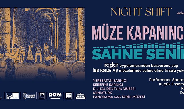 (İSTANBUL) - İstanbul Büyükşehir Belediyesi (İBB) Kültür A.Ş.’nin müzik üreten ancak sahne alma fırsatı bulamayan her yaştan sanatçıya fırsat sunduğu "Sahne Senin" projesi, Kültür A.Ş. müzelerinde “Sahne Senin Night Shift” adıyla geceye özel bir formata taşınıyor. İBB Kültür A.Ş.’nin yeni projesi Sahne Senin Night Shift, müzeler kapandıktan sonra gerçekleşen etkinliklerle müzelerin büyülü atmosferinde sanatseverlere ve sanatçılara eşsiz bir deneyim yaşatmayı ve müzisyenlere sahne alma imkanı sunmayı hedefliyor. Proje, müzeleri sadece sergi alanı olmaktan çıkararak, gecenin karanlığında kültür, müzik ve sanatın buluştuğu dinamik bir sahneye dönüştürüyor.Sahne Senin Night Shift, sahne bulma imkanı sınırlı olan her yaştan sanatçıya performansını sergileme fırsatı sunmayı amaçlıyor. Projeye başvuran ve videolarını paylaşan DJ’ler, 'ensemble' olarak tanımlanan müzik grupları, korolar, performans sanatçıları ve dansçılar, Kültür A.Ş. işletmesindeki Yerebatan Sarnıcı, Şerefiye Sarnıcı, Dijital Deneyim Müzesi, Panorama 1453 Tarih Müzesi ve Miniatürk’te sahne alma fırsatı yakalayacak.Projeye başvurmak isteyen sanatçılar, başvurularını Radar Türkiye mobil uygulaması üzerinden yapabilecek ve performans videolarını paylaşabilecek. Sahne Senin Night Shift’e katılmaya hak kazanan sanatçılar, müze kapandıktan sonra düzenlenen özel Night Shift etkinliklerinde sahne alacak. Night Shift ile Sahne Senin geleneği devam ediyorDaha önce “Sahne Senin” kapsamında birçok genç sanatçıya İBB Kültür A.Ş.’nin düzenlediği konserler ve festivallerde büyük sanatçılarla sahne alma fırsatı sunuldu. Bu yenilikçi formatla müzik ve performans sanatlarıyla ilgilenen sanatçıların izleyici karşısına çıkmalarına destek verildi. Şimdi ise bu heyecan verici deneyim gecenin gizemli atmosferine taşınıyor. Kategoriler-Yerebatan Sarnıcı (Performans Sanatları)-Şerefiye Sarnıcı (Küçük Ensemble)-Dijital Deneyim Müzesi (Koro)-Miniatürk (Dans)-Panorama 1453 Tarih Müzesi (DJ)