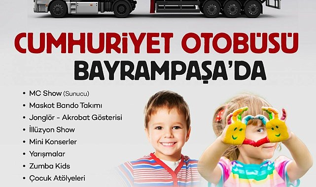 (İSTANBUL) - İstanbul Büyükşehir Belediyesi’nin (İBB) çocukları eğlendirmek amacıyla mahalle mahalle gezen Cumhuriyet Otobüsü bugün yeniden Bayrampaşalı çocukları eğlendirmeye geliyor. İlk olarak 23 Nisan 2023’te yollara düşen İBB’nin Cumhuriyet Otobüsü, çocukları eğlendirmeye devam ediyor. İstanbul’u ilçe ilçe, mahalle mahalle gezen otobüs, ikinci kez Bayrampaşalı çocukları eğlendirecek. Cumhuriyet Otobüsü bugün Cevatpaşa Mahallesi muhtarlık binası önünde, 15.00-18.00 saatleri arasında maskot bando takımı, jonglör akrobat gösterisi, çocuk atölyeleri, illüzyon şov, mini konserler, yarışmalar ve zumba kids ile çocuklarla buluşacak.