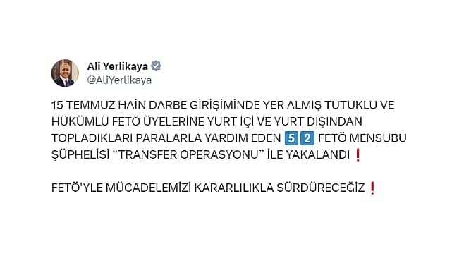 İçişleri Bakanı Ali Yerlikaya, 11 ilde düzenlenen "Transfer operasyonu" ile 15 Temmuz hain darbe girişiminde yer almış tutuklu ve hükümlü FETÖ üyelerine yurt içi ve yurt dışından topladıkları paralarla yardım eden 52 şüphelinin yakalandığını duyurdu.İçişleri Bakanı Ali Yerlikaya, sosyal medya hesabından yaptığı açıklamada FETÖ ile mücadelenin kararlılıkla sürdürüldüğünü bildirdi. Yerlikaya'nın açıklamasına göre, Antalya Jandarma Komutanlığı, Terörle Mücadele (TEM) Dairesi ile İstihbarat başkanlıklarının FETÖ finans kaynaklarının deşifre edilmesine yönelik yapılan çalışmaları sonucunda, örgütten tutuklu, hükümlü kişiler ile ailelerine yur içi ve yurt dışından transfer edilen paralarla maddi destek sağlayan 52 şüpheliye yönelik, Antalya merkezli toplam 11 ilde (Antalya, Mersin, Adana, Osmaniye, Şanlıurfa, Isparta, Denizli, İzmir, Bursa, Kocaeli, Ankara) operasyon düzenlendi.Operasyonlarda şüphelilerin tamamı yakalandı; haklarında adli işlemler başlatıldı.Bakan Yerlikaya, söz konusu açıklamasında, "Operasyonu düzenleyen Jandarmamızı tebrik ediyorum. Halkımızın üzerine ateş açan, tanklarla ezmeye çalışan hainlere göz açtırmayacağız" dedi.