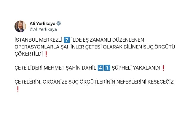 İçişleri Bakanı Ali Yerlikaya, "İstanbul merkezli 7 ilde düzenlenen operasyonlarla Şahinler Çetesi olarak bilinen suç örgütü çökertildi. Çete lideri Mehmet Şahin dahil 41 şüpheli yakalandı" dedi.İçişleri Bakanı Ali Yerlikaya, sosyal medya hesabından yaptığı paylaşımda "Şahinler Çetesi"nin çökertildiğini duyurdu. Yerlikaya paylaşımında şu ifadelere yer verdi:"İstanbul Organize Suçlarla Mücadele Şube Müdürlüğümüzce kamuoyunda Şahinler olarak bilinen, liderliğini Mehmet Şahin’in yaptığı Organize Suç Örgütü üyelerine yönelik operasyon düzenlendi.Şüphelileri yakalamak için İstanbul, İzmir, Muğla, Ankara, Ordu, Bartın, Samsun illerinde 54 adrese yönelik eş zamanlı operasyon gerçekleştirildi. 41 şüpheli şahıs yakalandı. Operasyonda 16 ruhsatsız adet tabanca ve 660 adet fişek, 2 av tüfeği, 3 çelik yelek ile muhtelif miktarda uyuşturucu ve nakit para ele geçirildi."