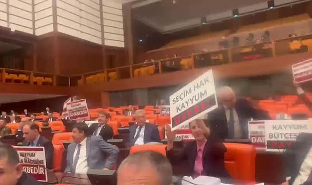 (TBMM) - Bütçe görüşmelerinde Genel Kurul’a hitap eden İçişleri Bakanı Ali Yerlikaya’nın kürsüdeki konuşması sırasında CHP ve DEM Parti Milletvekilleri ellerindeki dövizlerle kayyum atamalarını protesto etti. CHP ve DEM milletvekilleri “Kayyum halk iradesine darbedir” yazılı dövizlerle taşıdı.TBMM Genel Kurulu'nda, Çalışma ve Sosyal Güvenlik Bakanlığı, İçişleri Bakanlığı ile Tarım ve Orman Bakanlığı'nın bütçelerinin görüşmeleri sürüyor. Yürütme adına Genel Kurul’a hitap eden İçişleri Bakanı Ali Yerlikaya’nın kürsüdeki konuşması sırasında CHP ve DEM Parti Milletvekilleri ellerindeki dövizlerle kayyum atamalarını protesto etti.Milletvekilleri ellerinde; Bakan Yerlikaya’nın konuşması boyunca “Kayyum halk iradesine darbedir” ,”Kayyuma değil, halka bütçe”, “Seçim hak, kayyum darbe” yazılı dövizleri taşıdı.