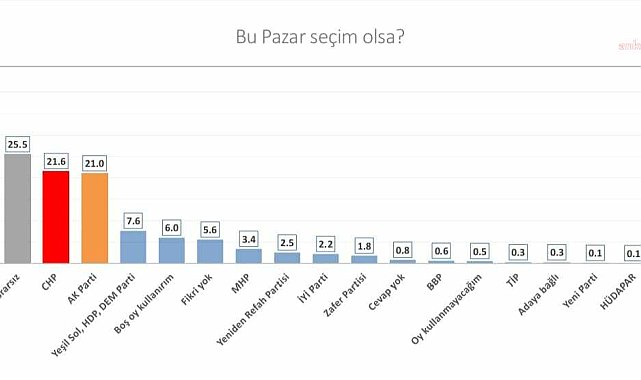 Kararsızlar, fikir belirtmeyenler ve oy kullanmayacağını söyleyenlerin oyları aritmetik dağıtıldığında ise CHP yüzde 35,2'lik, AK Parti ise yüzde 34,3'lik oy oranına ulaşıyor. Üçüncü sırada yüzde 12,4 ile DEM Parti, dördüncü sırada yüzde 5,6 ile MHP, beşinci sırada yüzde 4,2 ile Yeniden Refah Partisi yer alıyor. İYİ Parti ve Zafer Partisi ise sırasıyla yüzde 3,6 ve yüzde 3'lük oy oranına ulaşıyor.