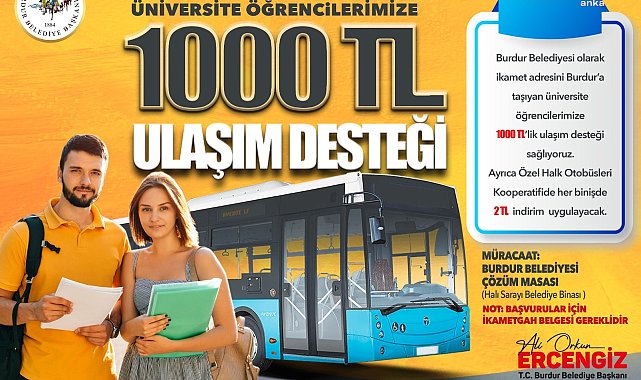 (BURDUR) - Burdur Belediyesi, 31 Aralık 2024 tarihine kadar ikametini şehre aldıran öğrencilere 1000 TL ulaşım desteği verecek. Burdur Belediye Başkanı Ali Orkun Ercengiz, ikametini Burdur’a alan öğrencilere 1000 TL ulaşım desteği verileceğini duyurdu. Başkan Ercengiz, şu açıklamayı yaptı:“Burdur Özel Halk Otobüsleri'nden yararlanmak isteyen ve yararlanan öğrencilerimize ikametgahlarını Burdur’a almaları halinde 1000 TL kent kartlarına yüklenmek kaydı ile yol ulaşım desteği verme sözünü vermiştik. Bu yıl da öğrencilerimizin taşınma ücretlerine biraz daha katkı koyabilmek için bu rakamı kişi başına 1000 TL’ye çıkarttık. Öğrencilerimizin Burdur’da ikamet ettiklerini 31 Aralık 2024 tarihine kadar belgeledikten sonra biz kent kart yükleme noktalarından yüklenilmek üzere 1000 TL’lik yol desteğini öğrencilerimize vermeyi yeniden taahhüt ediyoruz. Ayrıca Özel Halk Otobüsleri Kooperatifi de her binişte 2 TL indirim uygulayacak.”