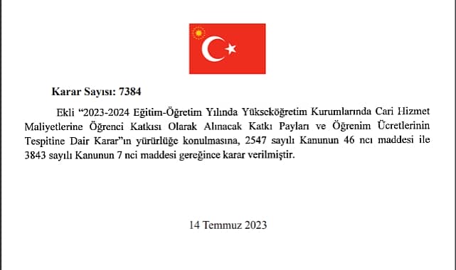 Cumhurbaşkanı'nın 7384 sayılı "2023-2024 Eğitim-Öğretim Yılında Yükseköğretim Kurumlarında Cari Hizmet Maliyetlerine Öğrenci Katkısı Olarak Alınacak katkı Payları ve Öğrenim Ücretlerinin Tespitine Dair Karar"ı bugünkü Resmi Gazete'te yayınlandı.Karara göre, 2023-2024 Eğitim-Öğretim Yılı'nda öğrenimine devam eden veya yeni kayıt yaptıracak birinci öğretim ve açık öğretim gören öğrencilerden katkı payı alınmayacak. Bu öğrencilerden alınması gereken katkı payları önceki yıllarda olduğu gibi devlet tarafından karşılanacak. Bu fıkra kapsamında 2023-224 Eğitim-Öğretim Yılı'nda devlet tarafından karşılanacak katkı payı yüzde 40 artırımlı olarak ödenecek. İkinci öğretime zam geldiSöz konusu kararla ikinci öğretimde okuyan öğrencilerin öğrenim ücretlerinde artış yapıldı. Tablolarda yer alan cari hizmet maliyetleri geçen yıla göre 63,72 oranında arttığı için ikinci öğretim öğrenim ücretleri de bu oranda arttı.Yurt dışından kayıt yaptıran öğrencileri 2 katından az olmamak üzere öğrenim ücreti ödeyecekYurt dışından öğrenci kabul kontenjanları kapsamında yeni kayıt yaptıracak öğrenciler cari hizmet maliyetinin iki katından az olmamak üzere öğrenim ücreti ödeyecek.Geçen yıl kayıt yaptıran bu öğrenciler cari hizmet maliyetinin 1,5 katından az olmamak üzere öğrenim ücreti ödemişlerdi. Geçen yıl ve daha önceki yıllarda kayıt yaptıran öğrencilerin hakları devam ediyor.