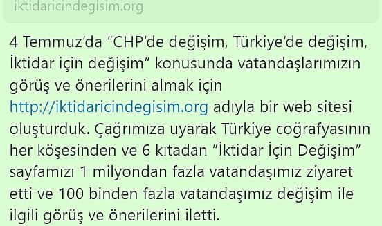 Mayıs ayında yapılan Cumhurbaşkanlığı ve Milletvekili Genel Seçimleri'nin ardından "CHP'de değişim" çağrısı yapan İBB Başkanı Ekrem İmamoğlu, 4 Temmuz’da “CHP’de değişim, Türkiye’de değişim, İktidar için değişim” konusunda vatandaşların görüş ve önerilerini almak için kurdukları "http://iktidaricindegisim.org" adlı web sitesine giren sayısı ile siteye gelen görüş ve önerilerle ilgili bir paylaşımda bulundu. İmamoğlu, "Çağrımıza uyarak Türkiye coğrafyasının her köşesinden ve 6 kıtadan 'İktidar İçin Değişim' sayfamızı 1 milyondan fazla vatandaşımız ziyaret etti ve 100 binden fazla vatandaşımız değişim ile ilgili görüş ve önerilerini iletti" dedi."Siyaset bilimi, sosyoloji ve iletişim uzmanlarından oluşan bir heyet vatandaşlarımızın görüş ve önerilerini; yaş, cinsiyet ve coğrafi lokasyon kırılımları ile inceledi. İletişim uzmanları NLP yöntemi ile duygu analizi yaptı, semantik arama aracı ile mikro seviyede de analizler gerçekleştirdi. Bu çağrımıza destek olan ve katkı sunan herkese çok teşekkür ederim" diyen İmamoğlu'nun paylaşımının devamında şöyle denildi:"Gelen öneriler ve yorumlar şu konularda belirginleşti:- Toplum, CHP’de lider ve yönetiminin değişmesini, bu değişimin hem kuşak hem vizyon ekseninde olmasını istiyor. Toplumun ihtiyaçlarına uygun net bir vizyon ve politikalar belirlenmesini, kapsayıcı bir demokrasi ve laiklik anlayışının üretilmesini bekliyor.- Tabanla bağlantıların güçlenmesi, demokratik, hizmet odaklı bir muhalefet yapısının, dilinin ve üslubunun oluşturulmasını bekliyor.- Değişim ve yeniliği kucaklayan, yeni bir parti yapısı görmek istiyor.- Gençlerin ilgisini çekecek yapıların teşvik edilmesini, gençlerin güçlendirilmesini, talep ediyor.- İletişimi güçlendirmemizi, değişim vizyonumuzu duymak istiyor.- Ayakları yere basan bir siyaset benimsememizi, Atatürk ilkelerine bağlı bir tutumu öne çıkarmamızı bekliyor." dedi.