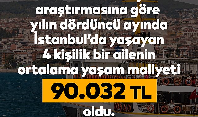 (İSTANBUL) - İstanbul Planlama Ajansı (İPA), yapılan araştırmalara göre nisan ayında İstanbul’da dört kişilik bir ailenin yaşam maliyetinin bir önceki aya göre, yüzde 2,91 artarak 90 bin 32 liraya yükseldiğini bildirdi.İPA'nın sosyal medya hesabından yapılan açıklamada, İstanbul’da dört kişilik bir ailenin nisan ayındaki yaşam maliyetine yer verildi.Açıklamada, yapılan araştırmalara göre, İstanbul'da dört kişilik bir ailenin yaşam maliyetinin nisan ayında bir önceki aya göre yüzde 2,91, geçen yılın aynı ayına göre ise yüzde 51,74 oranında arttığı belirtildi. İstanbul'da dört kişilik bir ailenin yaşam maliyetinin 90 bin 32 lira olduğu ifade edildi.