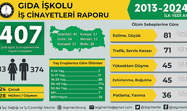 (ANKARA) - İşçi Sağlığı ve İş Güvenliği Meclisi (İSİG) gıda iş kolundaki işçi ölümleri raporunu yayımladı. Rapora göre, 2013 yılından bugüne en az 407 işçi çalışırken hayatını kaybetti.İSİG'in yayımladığı gıda iş kolundaki işçi cinayetleri raporunu yayımladı. Raporda, 2013 yılından bu yana en az 407 işçi çalışırken hayatını kaybettiği tespitine yer verildi. Gıda iş kolunda iş cinayetlerinde, 14 yaş ve altı 7 çocuk işçi, 15-17 yaş arası 17 çocuk/genç işçi, 18-29 yaş arası 88 işçi, 30-49 yaş arası 174 işçi, 50-64 yaş arası 79 işçi, 65 yaş ve üstü 7 işçi hayatını kaybetti. Hayatını kaybeden 35 işçinin ise yaş bilgileri tespit edilemedi.Hayatını kaybedenlerin yüzde 92'si erkekİSİG Raporu'na göre; gıda iş kolunda işçi ölümleri cinsiyetlere göre sıralandığında, 33 kadın ve 374 erkek işçi hayatını kaybetti.En çok görülen ölüm nedeni ezilmeGıda iş kolunda yaşanan ölümlerin nedenlerine göre dağılımı sıralandığında, ezilme, göçük nedeniyle 81 işçi, trafik, servis kazası nedeniyle 71 işçi, yüksekten düşme nedeniyle 45 işçi, zehirlenme, boğulma nedeniyle 45 işçi, patlama, yanma nedeniyle 36 işçi, kalp krizi, beyin kanaması nedeniyle 32 işçi, şiddet nedeniyle 25 işçi, elektrik çarpması nedeniyle 22 işçi, intihar nedeniyle 12 işçi, kesilme, kopma nedeniyle 11 işçi, Covid-19 nedeniyle 8 işçi, nesne çarpması, düşmesi nedeniyle 6 işçi; diğer nedenlerden dolayı 13 işçi hayatını kaybettiGıda iş kolundaki örgütsüzlükRaporda, gıda iş kolunda ölen işçilerin 12’sinin (yüzde 2,94) sendikalı, 395’inin ise (yüzde 97,06) sendikasız olduğu bilgisine yer verildi."Polonez işçileri insanca yaşayacak ücret ve çalışma koşulları için direnişte" İSİG Raporu'nda, işlenmiş gıda üretimi yapan Polonez'de işten çıkarılan 135 işçiye de değinildi. Raporda işverenin sendikal süreci engellemeye çalıştığı ve işçilerin haksız gerekçelerle iş akdinin feshedildiği belirtildi.
