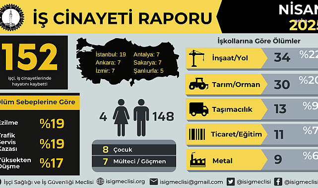 (ANKARA)- İşçi Sağlığı ve İş Güvenliği (İSİG) Meclisi’nin, nisan ayı raporunda, ''Nisan ayında en az 152 işçi hayatını kaybetti. Böylece 2025 yılının ilk dört ayında iş cinayeti sayısı (Ocak 178, Şubat 124, Mart 157, Nisan 152) 611’e ulaştı'' denildi.İSİG Meclisi, nisan ayına ilişkin verileri yayımladığı ''İş Cinayeti'' raporunda, tespit edebildikleri kadarıyla nisan ayında en az 152 işçinin hayatını kaybettiği kaydedildi. Böylece 2025 yılının ilk dört ayında iş cinayeti sayısının (Ocak 178, Şubat 124, Mart 157, Nisan 152) olmak üzere 611’e ulaştığı belirtilen raporda, nisan ayında inşaat, tarım, taşımacılık, ticaret/büro/eğitim/sinema ve metal işkollarındaki ölümlerin ilk sıralarda yer aldığı vurgulandı. Raporda, şu tespitler yer aldı:''İş cinayetlerine sektörel olarak baktığımızda ise sanayide 49 işçi, hizmette 37 işçi, inşaatta 35 işçi ve tarımda 31 işçi hayatını kaybetti. Tarımda orman işçileri, sanayide ve inşaatta kayıtdışı çalışanlar, uzun yol şoförleri; yatay kesen olarak güvencesiz çalışanlar en çok iş cinayetlerinde ölen işçilerdir. İnşaatlardaki yüksekten düşmeler işkolundaki ölümlerin yüzde 33’ünü, trafik kazası taşımacılık işkolundaki ölümlerin yüzde 90’ını, ezilmeler tarımdaki ölümlerin yüzde 48’ini oluştururken, kalp krizi/beyin kanaması nedenli ölümler hemen hemen her sektörde meydana geldi.'' İlk sıralarda üç büyükşehir var...''İş cinayetlerinde'' ilk sıralarda İstanbul, Ankara ve İzmir gibi büyükşehirlerin olduğu vurgulanan raporda, şunlar kaydedildi:''Nisan ayında 8 çocuk işçi iş cinayetlerinde hayatını kaybetti. Ölen çocukların ikisi tarım, ikisi inşaat, biri maden, biri enerji, biri genel işler ve biri konaklama işkollarında çalışıyordu.İş cinayetlerinde ölenlerin 4’ü kadın işçiydi. Kadınlar tarım, tekstil ve genel işler işkollarında çalışıyordu.Nisan ayında 7 göçmen işçi (üçü Afganistanlı, ikisi Suriyeli, biri İranlı, biri Türkmenistanlı) hayatını kaybetti. Göçmen işçiler tarım, metal ve inşaat işkollarında çalışıyordu.Ölen işçilerin öğrenebildiğimiz kadarıyla 6’sı (yüzde 3,94) sendika üyesi, 146’sı (yüzde 96,06) sendikasız. Sendikalı işçiler metal, güvenlik, eğitim ve inşaat işkollarında çalışıyordu.''