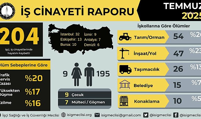 (ANKARA)- İşçi Sağlığı ve İş Güvenliği (İSİG) Meclisi'nin İş Cinayetleri Raporu'na göre, temmuz ayında en az 204 işçi, yılın ilk yedi ayında ise bin 165 işçi hayatını kaybetti. İSİG Meclisi, temmuz ayı İş Cinayetleri raporunu yayınladı. Raporda, temmuz ayında en az 204 işçinin, yılın ilk yedi ayında ise bin 165 işçinin hayatını kaybettiği belirtildi. Raporun ilgili bölümünde şu ifadeler yer aldı:"Yüzde 76’sını ulusal basından; yüzde 24’ünü ise işçilerin mesai arkadaşları, aileleri, iş güvenliği uzmanları, işyeri hekimleri, sendikalar ve yerel basından öğrendiğimiz bilgilere dayanarak tespit ettiğimiz kadarıyla Temmuz ayında en az 204 işçi hayatını kaybetti. Böylece 2025 yılının ilk yedi ayında iş cinayeti sayısı (Ocak 180, Şubat 124, Mart 159, Nisan 156, Mayıs 178, Haziran 164, Temmuz 204) 1165’e ulaştı."12 tarım işçisi yangına müdahalede hayatını kaybettiRaporda, temmuz ayında tarım sektöründe çalışan 54 kişinin hayatını kaybettiği kaydedilirken, 54 tarım işçisinin 12'sinin yurt genelindeki yangınlara müdahale sırasında yaşamını kaybettiği bilgisi yer aldı. Raporda ayrıca diğer işkollarından yangınlara müdahale sırasında hayatını kaybeden işçi sayısının 5 olduğu belirtildi. İş cinayetlerinde hayatını kaybeden işçilerin sektörel dağılımı şöyle:"Sanayide 59 işçi, tarımda 54 işçi, inşaatta 48 işçi ve hizmette 43 işçi."Ölüm nedenlerinin yüzde 75'i yüksekten düşmekRaporun işçilerin ölüm nedenlerinin sıralandığı bölümde, şu ifadeler yer aldı:"Ölüm nedenlerinde yüzde 75’i inşaatlarda olmak üzere yüksekten düşmeler; tır, kamyon, otobüs, taksi şoförleri, moto kuryeler ve tarım işçileri için trafik/servis kazaları; tarım/orman işçisi, çiftçi, inşaat ve sanayi işçileri için ezilmeler; her sektörü yatay bir kesen olarak kalp krizi, beyin kanamaları ölüm nedenleri olarak öne çıkıyor."Temmuz ayında en çok iş cinayetinin yaşandığı şehir İstanbul olarak kaydedilirken, onu takip eden şehirler sırasıyla Eskişehir, Bursa, İzmir, Antalya, Denizli, Hatay, Manisa, Gaziantep, Kahramanmaraş, Konya, Aksaray, Ankara, Çorum, Düzce, Kütahya, Malatya, Mersin, Muğla, Rize, Samsun ve Uşak oldu. En az 9 çocuk işçi hayatını kaybettiRaporda, temmuz ayında en az 9 çocuk işçinin de iş cinayeti sonucu hayatını kaybettiği, ölen çocuklardan üçünün tarım, ikisisinin inşaat, ikisisinin konaklama, birinin ticaret ve biri taşımacılık işkollarında çalıştığı kaydedildi.9 kadın işçi hayatını kaybetti9 kadın işçi de temmuz ayında hayatını kaybetti. Hayatını kaybeden kadın işçilerin tarım, gıda, taşımacılık, sağlık ve genel işler işkollarında çalıştığı bilgisi de raporda yer aldı.7 göçmen işçi hayatını kaybettiRaporda, temmuz ayında hayatını kaybeden göçmen işçilere ilişkin de veriler yer aldı. Rapora göre dördü Suriyeli, ikisi Afganistanlı, biri Türkmenistanlı olmak üzere 7 göçmen işçi hayatını kaybetti. Raporda, ölen işçilerin en az 8’inin (yüzde 3,92) sendika üyesi, 196’sının (yüzde 96,08) ise sendika üyeliğinin bulunmadığı belirtildi.