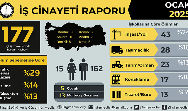 (ANKARA) - İşçi Sağlığı ve İş Güvenliği (İSİG) Meclisi'nin raporuna göre, ocak ayında en az 177 işçi hayatını kaybetti.İSİG Meclisi, ocak ayına ilişkin İş Cinayeti Raporu’nu açıkladı. Rapora göre, ocak ayında 177 işçi, iş cinayetlerinde hayatını kaybetti. İşkollarına göre ölümlerin yüzde 24’ü inşaat/yol, yüzde 16’sı taşımacılık, yüzde 13’ü tarım/orman, yüzde 10’u konaklama, yüzde 7’si ise ticaret/büro işkollarında yaşandı.Raporda, göre ölüm sebeplerine göre iş cinayetlerinin yüzde 29’unun trafik servis kazası, yüzde 14’ünün ezilme, yüzde 13’ünün ise yüksekten düşmeden kaynaklı yaşandığı belirtildi. Hayatını kaybeden işçilerin 162’sini erkek işçiler, 15’ini kadınlar, 5’ini çocuklar, 13’ünü ise mülteci/göçmen işçiler oluşturdu.İş cinayetleri yaş gruplarına göre incelendiğinde, 5-17 yaş arası 5 çocuk/genç işçi, 18-29 yaş arası 34 işçi, 30-49 yaş arası 67 işçi, 50-64 yaş arası 53 işçi, 65 yaş ve üstü 9 işçi ve yaşı bilinmeyen 9 işçi hayatını kaybetti.