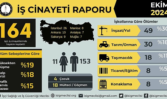 (ANKARA) - İşçi Sağlığı ve İş Güvenliği (İSİG) Meclisi’nin verilerine göre ekim ayında 164, yılın on ayında en az 1540 işçi hayatını kaybetti.İşçi Sağlığı ve İş Güvenliği (İSİG) Meclisi, 2034 yılı ekim ayına ilişkin iş cinayetleri raporunu açıkladı. Yüzde 62’sini ulusal basından; yüzde 38’ini ise işçilerin mesai arkadaşları, aileleri, iş güvenliği uzmanları, işyeri hekimleri, sendikalar ve yerel basından öğrendiğimiz bilgilere dayanarak tespit ettiğimiz kadarıyla ekim ayında en az 164, yılın ilk on ayında en az bin 540 işçi iş cinayetlerinde hayatını kaybetti.İSİG Meclisi'nin raporunda, 4 Eylül’de SGK’nin yayımladığı İş Kazası İstatistiklerine ilişkin, “Sermaye birikiminde tıkanmadan ve değersizleşmeden orta vadede kurtulmanın yolu, düşük teknolojili üretimle-düşük ücretlerle işçi verimliliğini artırmada aranıyor. Bu strateji, OVP’deki fason vaatlere rağmen, Türkiye kapitalizminin yapısal karakterinin zorunlu sonucudur. Yüksek kar marjını hedefleyen yüksek teknolojili üretime geçiş sancılı bir süreçtir. Bunun tek yolu ise Avrupa sermayesinin karlılığında sıçrama olmasına bağlanıyor” denilid.''Ekim ayında en az 164 işçi hayatını kaybetti''"Yüzde 62’sini ulusal basından; yüzde 38’ini ise işçilerin mesai arkadaşları, aileleri, iş güvenliği uzmanları, işyeri hekimleri, sendikalar ve yerel basından öğrendiğimiz bilgilere dayanarak tespit ettiğimiz kadarıyla Ekim ayında en az 164, yılın ilk on ayında en az bin 540 işçi iş cinayetlerinde hayatını kaybetti."En çok ölüm inşaat, yol iş kolunda"İnşaat, Yol iş kolunda 49 işçi; Tarım, Orman iş kolunda 30 emekçi (18 işçi ve 12 çiftçi); Taşımacılık iş kolunda 18 işçi; Ticaret, Büro, Eğitim, Sinema iş kolunda 8 işçi; Konaklama, Eğlence iş kolunda 8 işçi; Gıda, Şeker iş kolunda 7 işçi; Metal iş kolunda 6 işçi; Savunma, Güvenlik iş kolunda 6 işçi; Madencilik iş kolunda 5 işçi; Enerji iş kolunda 5 işçi; Gemi, Tersane, Deniz, Liman işkolunda 5 işçi; Belediye, Genel İşler işkolunda 5 işçi; Petro-Kimya, Lastik iş kolunda 2 işçi; Çimento, Toprak, Cam işkolunda 2 işçi; Ağaç, Kâğıt işkolunda 1 işçi; Sağlık, Sosyal Hizmetler işkolunda 1 işçi; Elimizdeki veriler ışığında çalıştığı işkolunu belirleyemediğimiz 6 işçi hayatını kaybetti.""Ölüm nedenlerinde ilk sırada yüksekten düşme ve kalp krizi var"Ekim ayında iş cinayetlerinin nedenlerine göre dağılımı ise şöyle:"Yüksekten düşme nedeniyle 31 işçi; kalp krizi, beyin kanaması nedeniyle 30 işçi; trafik, servis kazası nedeniyle 24 işçi; ezilme, göçük nedeniyle 21 işçi; şiddet nedeniyle 15 işçi; patlama, yanma nedeniyle 14 işçi; elektrik çarpması nedeniyle 8 işçi; intihar nedeniyle 7 işçi; zehirlenme, boğulma nedeniyle 4 işçi; nesne çarpması, düşmesi nedeniyle 2 işçi; kesilme, kopma nedeniyle 1 işçi; diğer nedenlerden 7 işçi hayatını kaybetti."