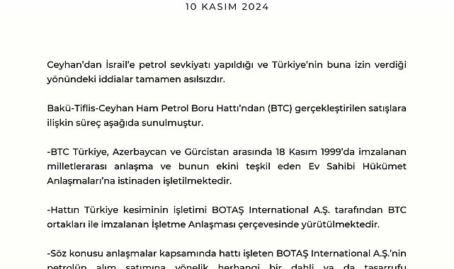 Bakü-Tiflis-Ceyhan Ham Petrol Boru Hattı'ndan (BTC) gerçekleştirilen satışlara ilişkin süreç aşağıda sunulmuştur.BTC Türkiye, Azerbaycan ve Gürcistan arasında 18 Kasım 1999'da imzalanan milletlerarası anlaşma ve bunun ekini teşkil eden Ev Sahibi Hükümet Anlaşmaları'na istinaden işletilmektedir.Hattın Türkiye kesiminin işletimi BOTAŞ International A.Ş. tarafından BTC ortakları ile imzalanan İşletme Anlaşması çerçevesinde yürütülmektedir.Söz konusu anlaşmalar kapsamında hattı işleten BOTAŞ International A.Ş.'nin petrolün alım satımına yönelik herhangi bir dahli ya da tasarrufu bulunmamaktadır.Petrolü BTC üzerinden taşıtarak Haydar Aliyev Limanı'ndan dünya pazarlarına satışını yapan şirketler, Türkiye'nin İsrail'e yönelik ticarete son verme kararına saygı duymuş ve teslim noktası İsrail olan herhangi bir yükleme gerçekleşmemiştir.