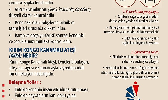 (ANKARA) - İstanbul Aile Hekimliği Derneği (İSTAHED) Bilim Komisyonu Başkanı Dr. Çınla Nişli Kaya, ölümcül Kırım Kongo Kanamalı Ateşi'nin (KKKA) nasıl bulaştığını, korunma yollarını ve yan etkilerini açıkladı. Kaya, "Kene deriye en yakın noktadan uygun bir cımbızla nazikçe, çevirmeden, düz bir şekilde çekilerek çıkarılmalıdır. Keneyi çıkarmak için üzerine kimyasal dökmek, yakmak gibi yöntemler kesinlikle uygulanmamalıdır. Eğer kene çıkarılamazsa hemen sağlık kuruluşuna başvurun" dedi.Kaya, yaptığı yazılı açıklamada, kenelere karşı korunmak için açık renkli, uzun kollu giysiler giyilmesi ve pantolon paçalarının çorapların içine sokulması gerektiğini belirterek, ormanlık veya çalılık alanlarda bulunacaklara pantolon, çizme ve şapka kullanmalarını tavsiye etti."Kene uygun bir cımbızla, düz şekilde çekilerek çıkarılmalı"Vücudun özellikle kasık, koltuk altı, dizlerin arkası gibi katlantı bölgelerinin düzenli kontrol edilmesi gerektiğini bildiren Kaya, "Kene, deriye en yakın noktadan uygun bir cımbızla nazikçe, çevirmeden, düz bir şekilde çekilerek çıkarılmalıdır. Keneyi çıkarmak için üzerine kimyasal dökmek, yakmak gibi yöntemler kesinlikle uygulanmamalıdır. Eğer kene çıkarılamazsa hemen sağlık kuruluşuna başvurun" uyarılarında bulundu.Kaya, açıklamasında şu bilgileri verdi:"Riskli bölgelerde piknik yaparken veya tarımla uğraşırken dikkatli olun, kamp ve doğa yürüyüşlerinden sonra kendinizi ve çocuklarınızı ayrıntılı bir şekilde inceleyin. Hayvancılıkla uğraşanlar hayvan barınaklarını belirli aralıklarla ilaçlatmalıdır.KKKA, keneler tarafından taşınan ve bulaştırılan, ateş, yaygın kas ağrıları ve kanama bozuklukları ile karakterize, ölümcül seyredebilme riski bulunan bir enfeksiyon hastalığıdır.Hastalık, enfekte kenenin insan cildine tutunmasıyla, hasta hayvanların kanı, vücut sıvıları veya dokularıyla temas yoluyla, hastalığı taşıyan bireylerin kanı veya vücut sıvılarıyla temas sonucu bulaşır.Kene tutunmuşsa, deriye en yakın noktadan uygun bir cımbızla nazikçe, çevirmeden, düz bir şekilde çekilerek çıkarılmalıdır. Keneyi çıkarmak için üzerine kimyasal dökmek, yakmak gibi yöntemler kesinlikle uygulanmamalıdır. Eğer kene çıkarılamazsa hemen sağlık kuruluşuna başvurun."Kene çıkarıldıktan sonra ellerinizi ve tutunduğu bölgeyi sabunlayın"Kene çıkarıldıktan sonra ellerinizi ve kenenin tutunduğu bölgeyi sabun ve bol su ile iyice temizleyin. Kenenin çıkarılmasını takip eden 10 gün içerisinde ateş, halsizlik, kaslarda ağrı gibi semptomlar ortaya çıkarsa hemen doktora başvurun."Kene ısırığından sonra yüksek ateş, baş ağrısı, halsizlik, kas ve eklem ağrıları, bulantı, kusma, ishal, ciltte morarmalar, burun ve diş eti kanamaları varsa sağlık kurumuna başvurulmasını tavsiye eden Kaya, "Kırım Kongo Kanamalı Ateşi, erken fark edildiğinde kontrol altına alınabilir. Ancak en güçlü savunma, hastalığa yakalanmamak için alınan basit ama kararlı önlemlerdir. Unutmayın; sağlığınızı korumanın ilk adımı, riskleri ciddiye almaktır" ifadelerini kullandı.