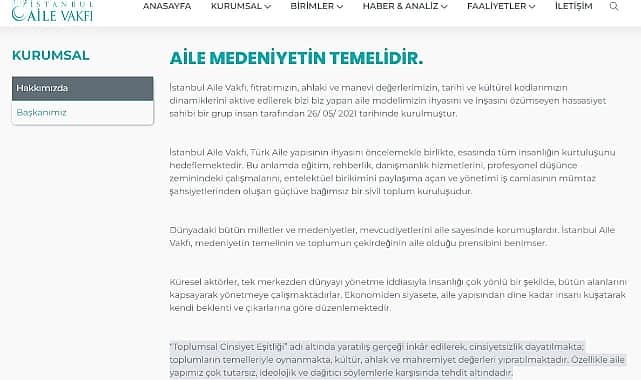 İstanbul Aile Vakfı, “LGBT Propagandasına dur” mitingine çağrı yaptığı videonun RTÜK tarafından kamu spotu olarak onaylanmasının ardından internet sitesindeki “Toplumsal cinsiyet eşitsizliği” ifadesi geçen cümleyi kaldırdı. “‘Toplumsal Cinsiyet Eşitliği’ adı altında yaratılış gerçeği inkar edilerek, cinsiyetsizlik dayatılmakta....” ifadesi yerine “Aileyi ifsat eden unsurlar...” ibaresi getirildi.