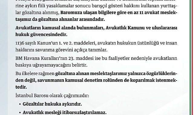 (İSTANBUL)- İstanbul Barosu tarafından 1 Mayıs kutlamalarında yaşanan gözaltılara ilişkin yapılan açıklamada, gözaltına alınan 11 avukatın serbest bırakılması istendi.İstanbol Barosu’nun sosyal medya hesabından yapılan yazılı açıklamada, 1 Mayıs Emek ve Dayanışma Günü nedeniyle gerçekleşen gösterilerde 11 avukatın gözaltına alındığı bildirildi. Yapılan gözaltıların hukuka aykırı olduğu belirten Baro’nun açıklamasında şu ifadelere yer verildi:"1 Mayıs gözaltıları hukuka aykırıdır! meslektaşlarımız derhal serbest bırakılmalıdır! 1 Mayıs 2025 günü İstanbul’da, anayasal düzene ve demokratik toplum ilkelerine aykırı fiili yasaklamalar sonucu barışçıl gösteri hakkını kullanan yurttaşlar gözaltına alınmış, Baromuza ulaşan bilgilere göre en az 11 avukat meslektaşımız da gözaltına alınanlar arasındadır.Avukatların kamusal alanda bulunmaları, Avukatlık Kanunu ve uluslararası hukuk güvencesindedir. 1136 sayılı Kanun’un 1. ve 2. maddeleri, avukatın hukukun üstünlüğü ve insan haklarını savunma görevini açıkça tanımlar. BM Havana Kuralları’nın 23. maddesi ise bu faaliyetler nedeniyle avukatların baskıya uğrayamayacağını belirtir. Bu ilkelere rağmen gözaltına alınan meslektaşlarımız yalnızca özgürlüklerinden değil, savunmanın kamusal denetim rolünden de koparılmak istenmektedir.İstanbul Barosu olarak çağrımızdır: Gözaltılar hukuka aykırıdır. Avukatlık mesleği itibarsızlaştırılamaz. Tüm meslektaşlarımız derhal ve koşulsuz serbest bırakılmalıdır. Sorumlular hakkında gerekli işlemler başlatılmalıdır. İstanbul Barosu, sürecin tüm yasal yollarla takipçisi olacaktır."