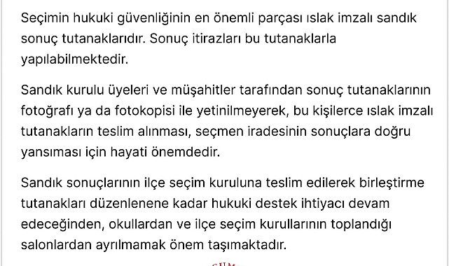 İstanbul Barosu, seçim sonuçlarının hukuki güvenliği için gönüllü görev yapan avukatlara, okulların ve ilçe seçim kurullarının toplandığı salonlardan ayrılmamaları çağrısında bulundu. Yapılan açıklamada, sandık sonuçlarının ilçe seçim kuruluna teslim edilip birleştirme tutanakları düzenlenene kadar hukuki ihtiyacın devam edeceğine vurgu yapıldı.İstanbul Barosu Başkanlığı, resmi Twitter hesabından yaptığı açıklamada, seçimin hukuki güvenliğinin en önemli parçasının ıslak imzalı sandık sonuç tutanakları olduğu belirtildi ve sonuçlara yönelik yapılan itirazların bu tutanaklarla yapılabileceğine işaret edildi. Paylaşımda, sandık sonuçlarının ilçe seçim kuruluna teslim edilip birleştirme tutanakları düzenlenene kadar hukuki ihtiyacın devam edeceği ve bu nedenle seçim kurullarının toplandığı salonlardan ayrılmamanın önemli olduğu belirtildi."SEÇMEN İRADESİNİN SONUÇLARA DOĞRU YANSIMASI HAYATİ ÖNEMDEDİR"İstanbul Barosu'nun, "Tüm Meslektaşlarımıza Çağrımızdır" başlıklı paylaşımı şöyle:"Seçimin hukuki güvenliğinin en önemli parçası ıslak imzalı sandık sonuç tutanaklarıdır. Sonuç itirazları bu tutanaklarla yapılabilmektedir. Sandık kurulu üyeleri ve müşahitler tarafından sonuç tutanaklarının fotoğrafı ya da fotokopisi ile yetinilmeyerek, bu kişilerce ıslak imzalı tutanakların teslim alınması, seçmen iradesinin sonuçlara doğru yansıması için hayati önemdedir. Sandık sonuçlarının ilçe seçim kuruluna teslim edilerek birleştirme tutanakları düzenlenene kadar hukuki destek ihtiyacı devam edeceğinden, okullardan ve ilçe seçim kurullarının toplandığı salonlardan ayrılmamak önem taşımaktadır.”